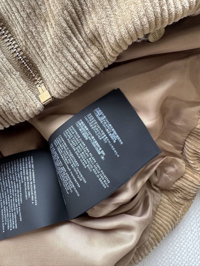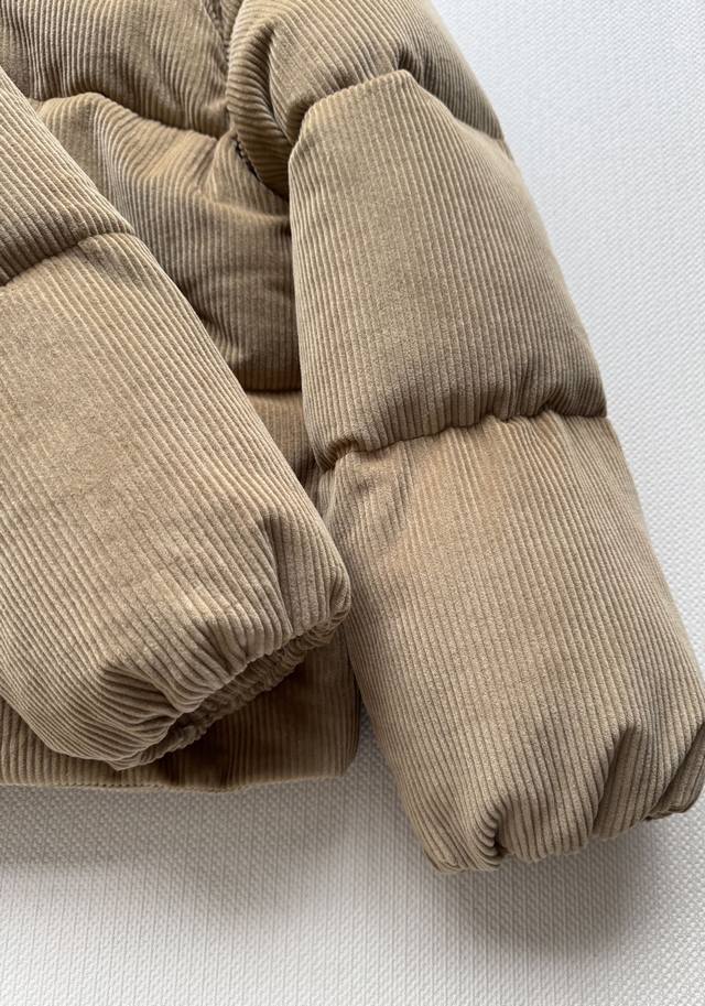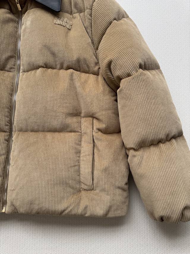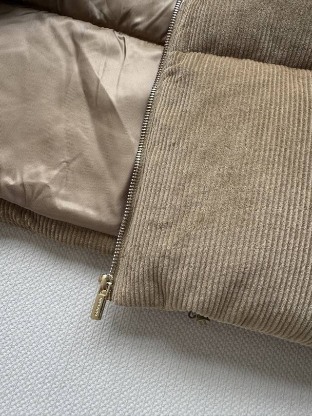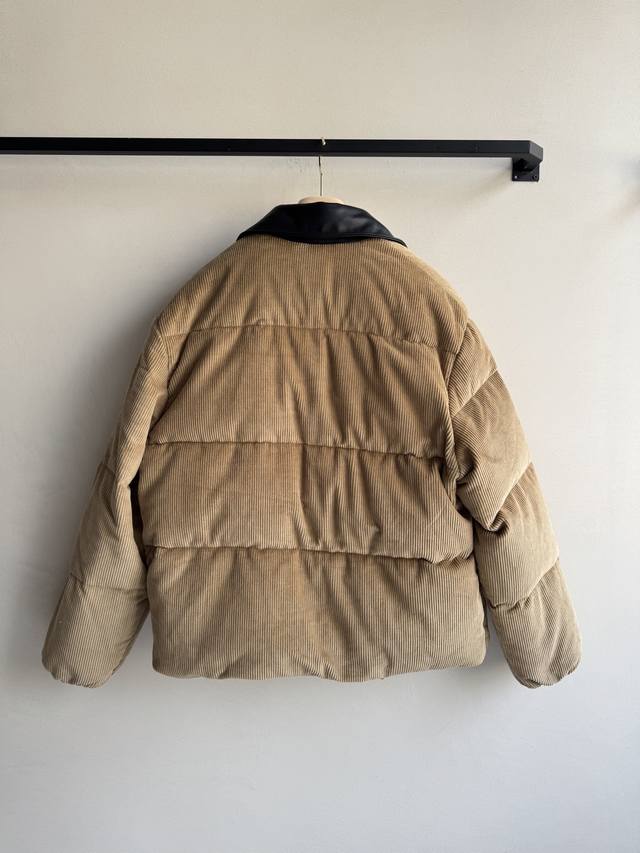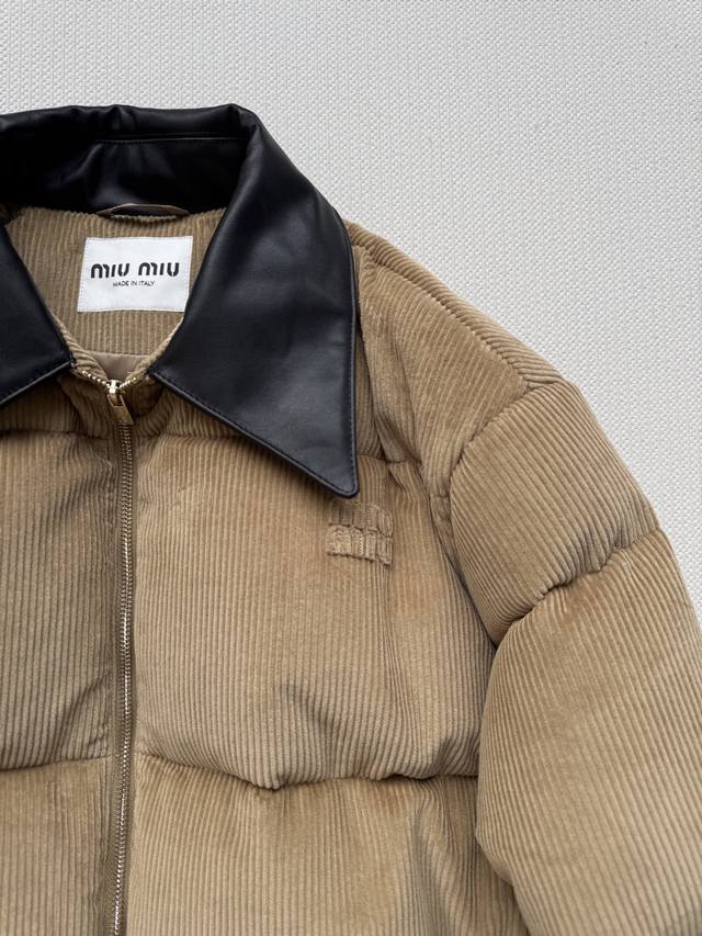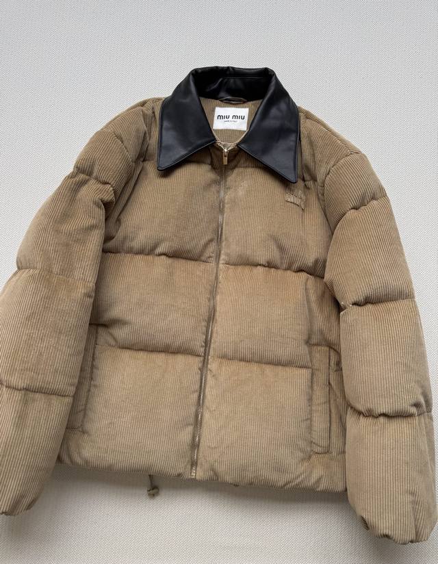Miumi* 25Fw Autumn/Winter New Corduroy Down Jacket with Genuine Leather Collar | Original Design! High-Quality Production! Made from select retro brown corduroy fabric, the vertical stripes exude a sense of age, subtly layering in the light. The black genuine leather collar adds a cool edge, a perfect finishing touch for switching between sweet and edgy styles. The oversized, voluminous silhouette is versatile enough to accommodate various inner layers, while the relaxed "puffer jacket" feel creates a casual and carefree winter look. Available in Sml.