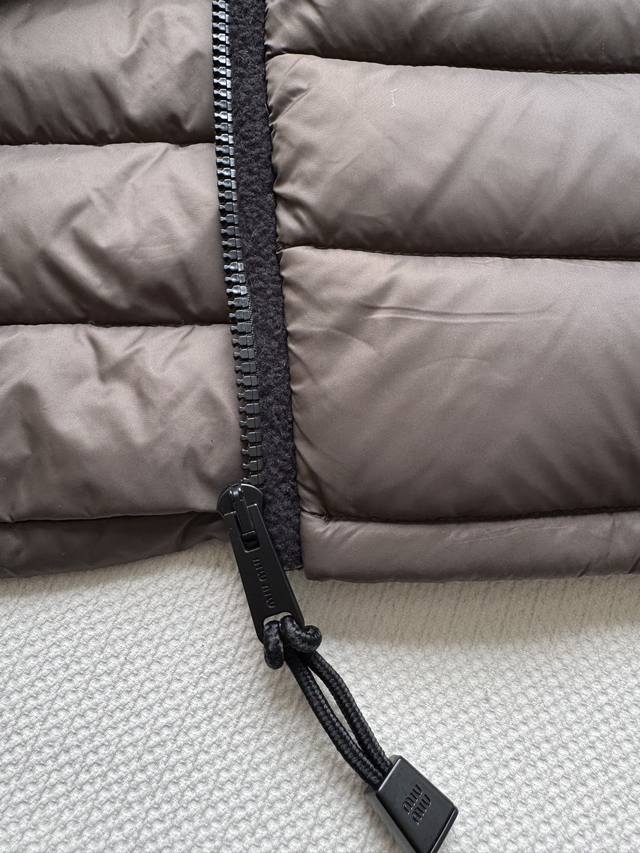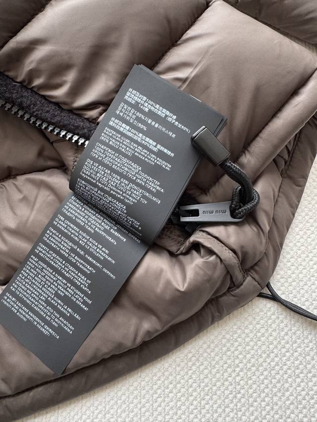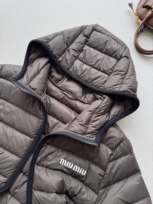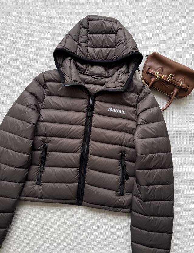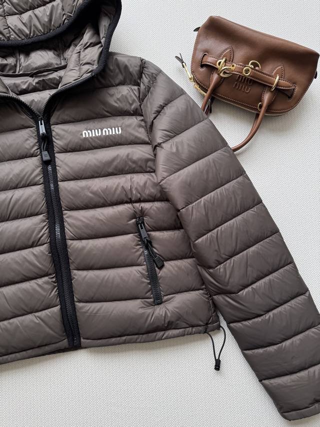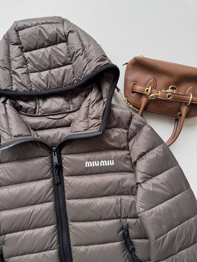 Miumi* 25Fw Autumn/Winter New Logo Embroidered Lightweight Hooded Down Jacket | Original Design! High-Quality Production! Filled with new national standard 90% white goose down, the down is fully packed! The inner filling undergoes a strict selection process, resulting in superior loft and resilience, and unquestionable warmth! Absolutely stunning fit! Highly recommended! In stock in sizes S, M, and D.