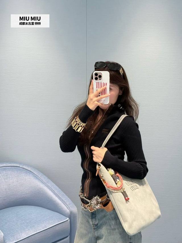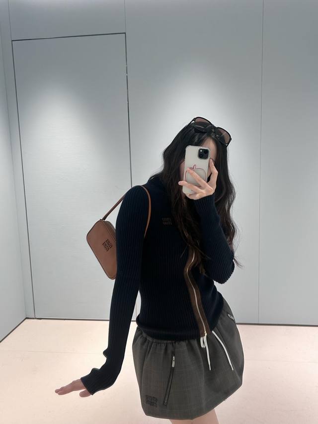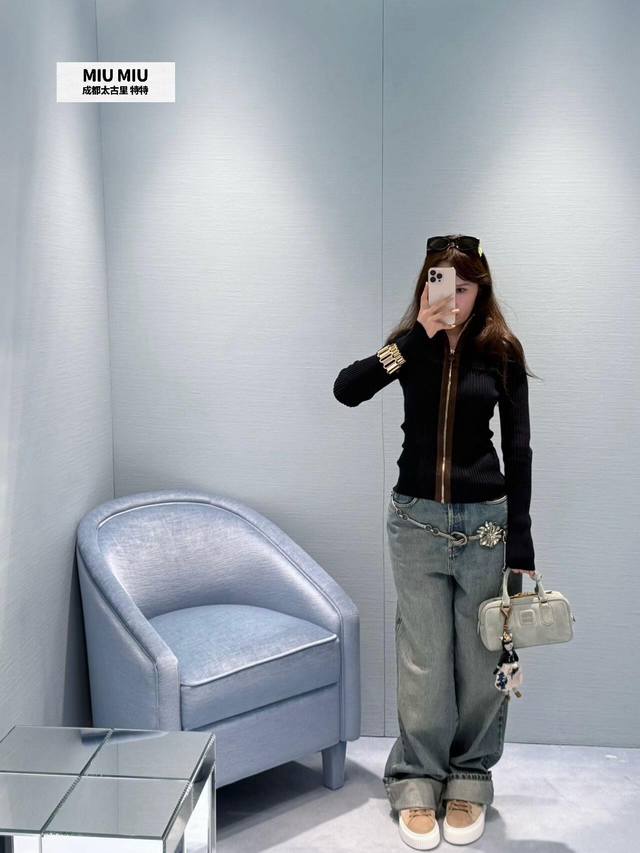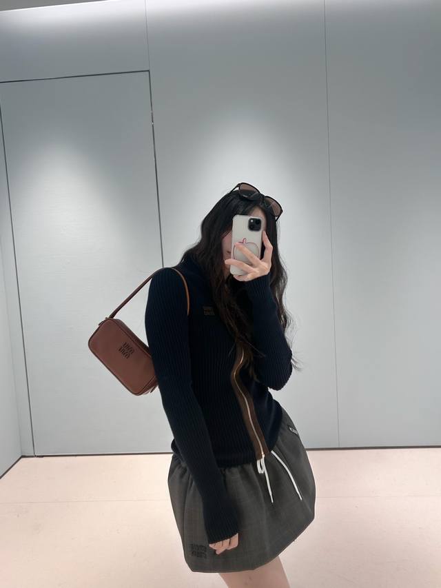 Miumi* 25Fw Early Autumn New Letter Logo Stand Collar Zipper Knit Cardigan | Exclusive Yb Development! High-Quality Production! Made of wool knit fabric, with a delicate texture and good stretch, comfortable and skin-friendly to wear; the combination of the stand collar and zipper is exquisitely crafted, and the iconic element on the chest is highly recognizable; it blends retro and sweet-cool styles, suitable for various early autumn outfits. In stock, sizes S, M, L, D.D.