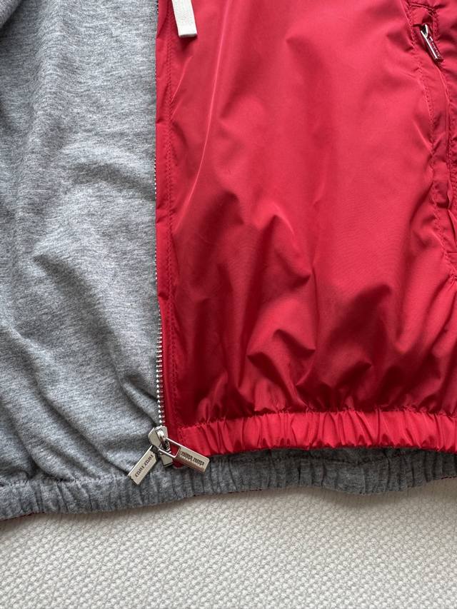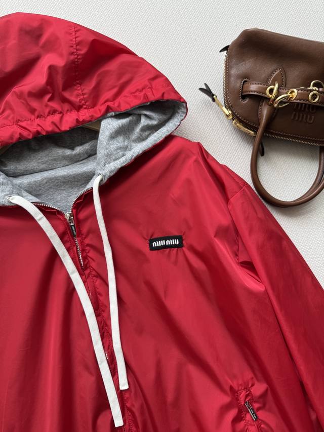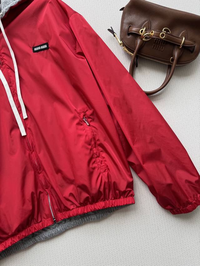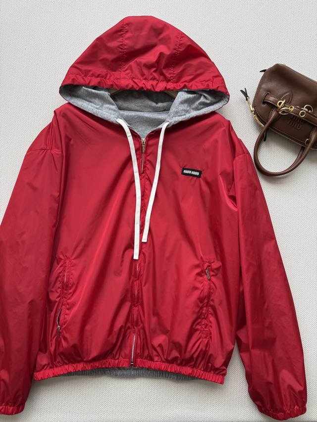 Miumi* 25Fw Early Autumn New Reversible Hooded Sweatshirt Jacket. Original design! High-quality production! 100% cotton, soft and comfortable. Slightly oversized fit, one side cotton, the other sporty/windbreaker material, two different styles on each side. Custom letter hardware zipper pull, laser-engraved letter patch on the chest, drawstring hood and pockets. Blue-gray color scheme is versatile and suits all body types, creating a unique look. In stock S, M, L.