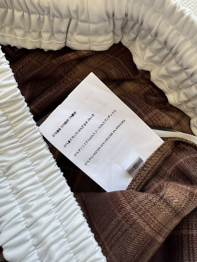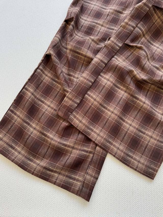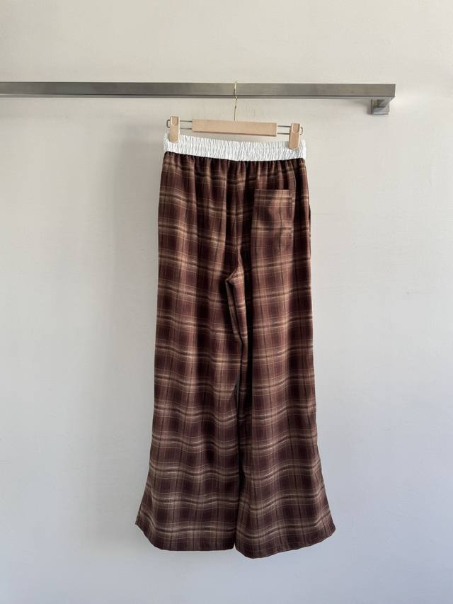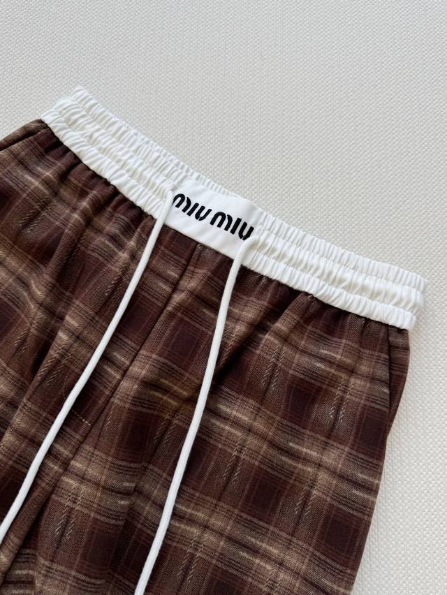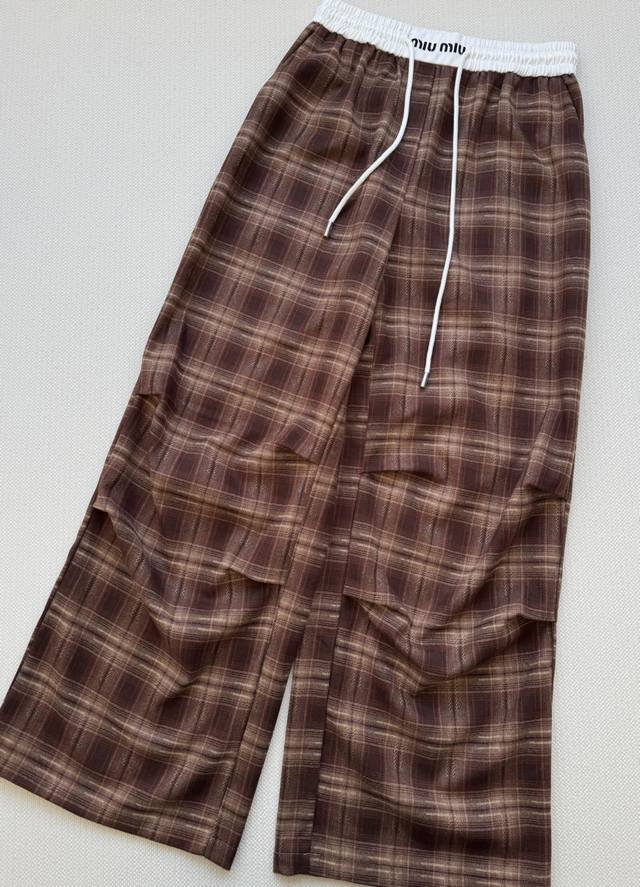 Miumi* 25Fw New elastic waist plaid wide-leg trousers with unique pleated design