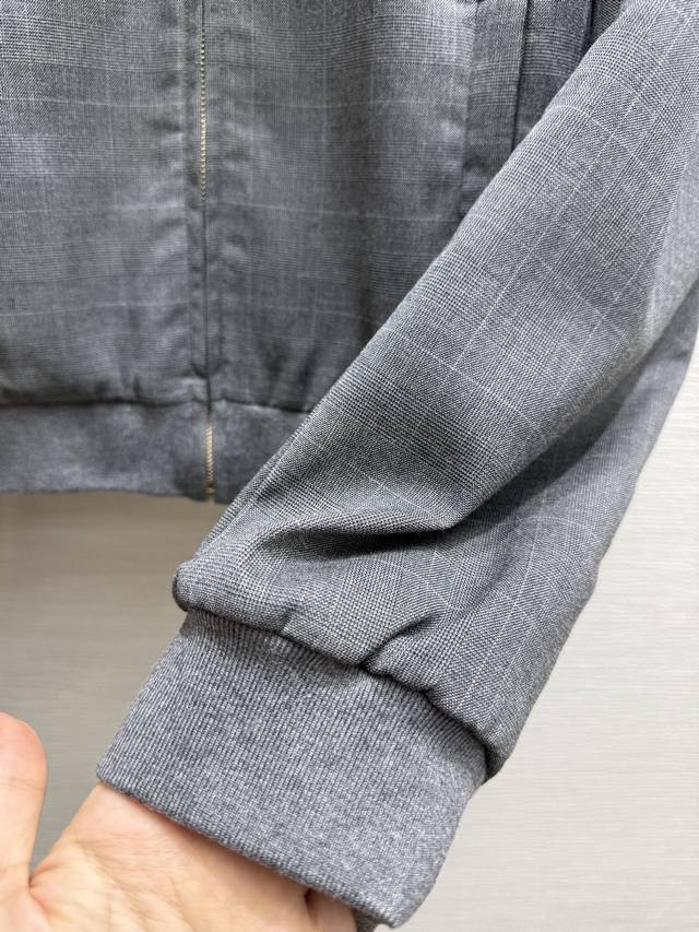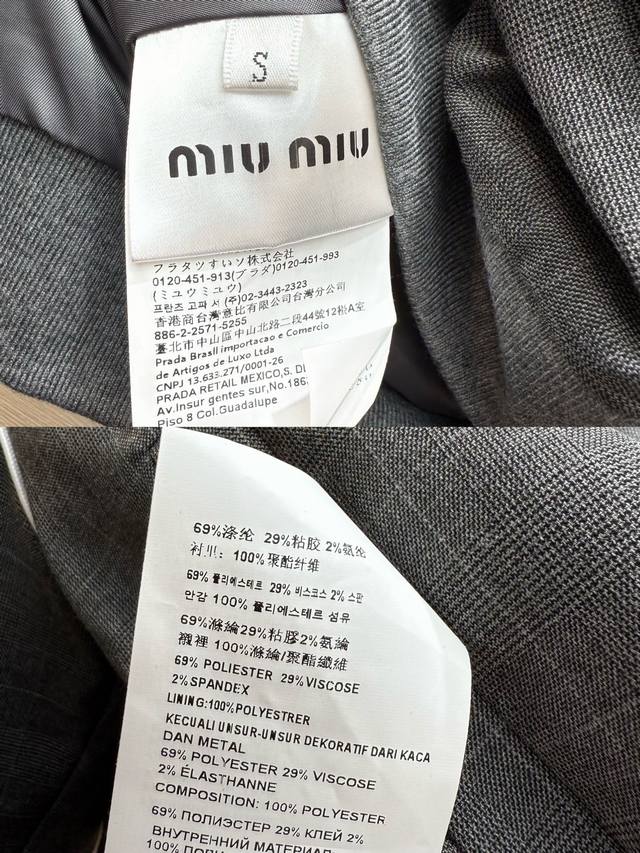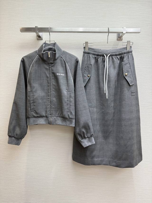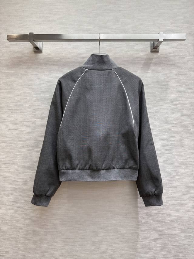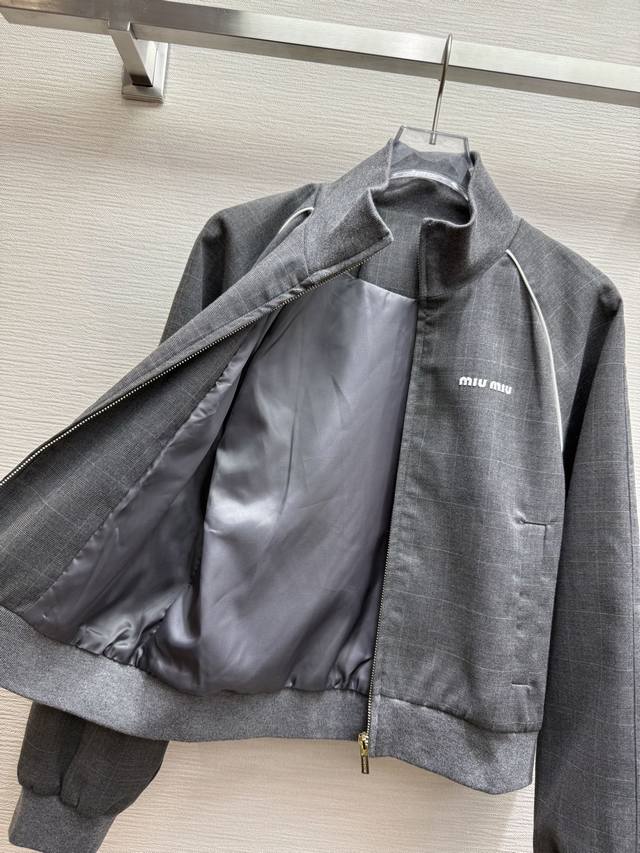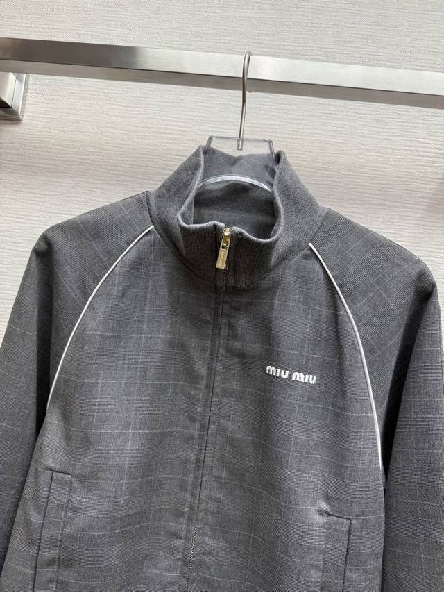 Miumi* 25Ss new gray plaid jacket with thread stitching design and letter embroidery decoration, fashionable and generous, single color, three sizes Smlb808p