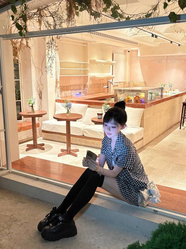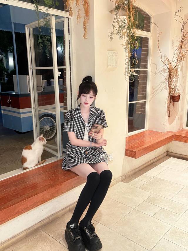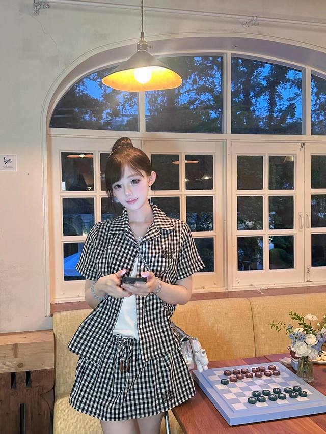 Miumi* 25Ss new spring and summer black and white small plaid short-sleeved shirt | Exclusive Yb development! High-quality product! Customized lightweight yarn-dyed plaid cotton fabric, smooth and delicate fabric, skin-friendly, breathable and wrinkle-resistant, with superb texture! The plaid-loving summer short-sleeved shirt, with retro Vichy black and white plaid elements that never go out of style, simple loose shirt version cut, single-breasted front closure, brown leather chest logo logo to add highlights, the details inside and out are very good, pair with shorts or skirts to create a cool summer outfit! Available now SML