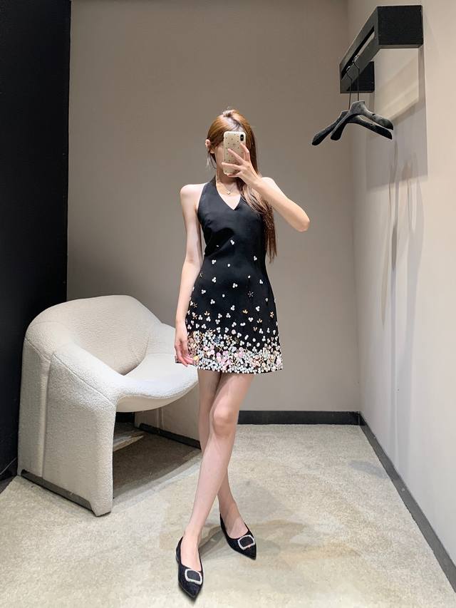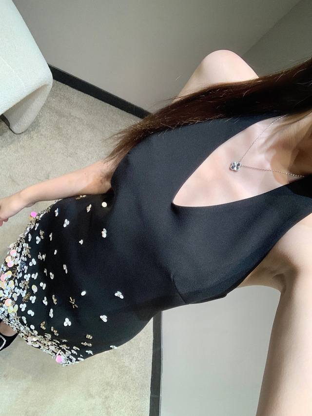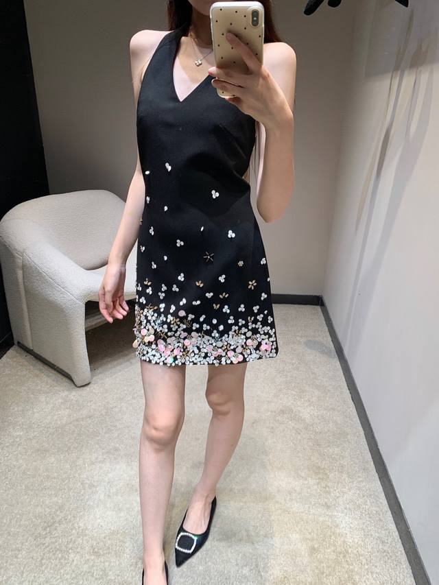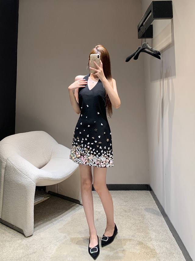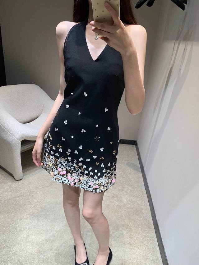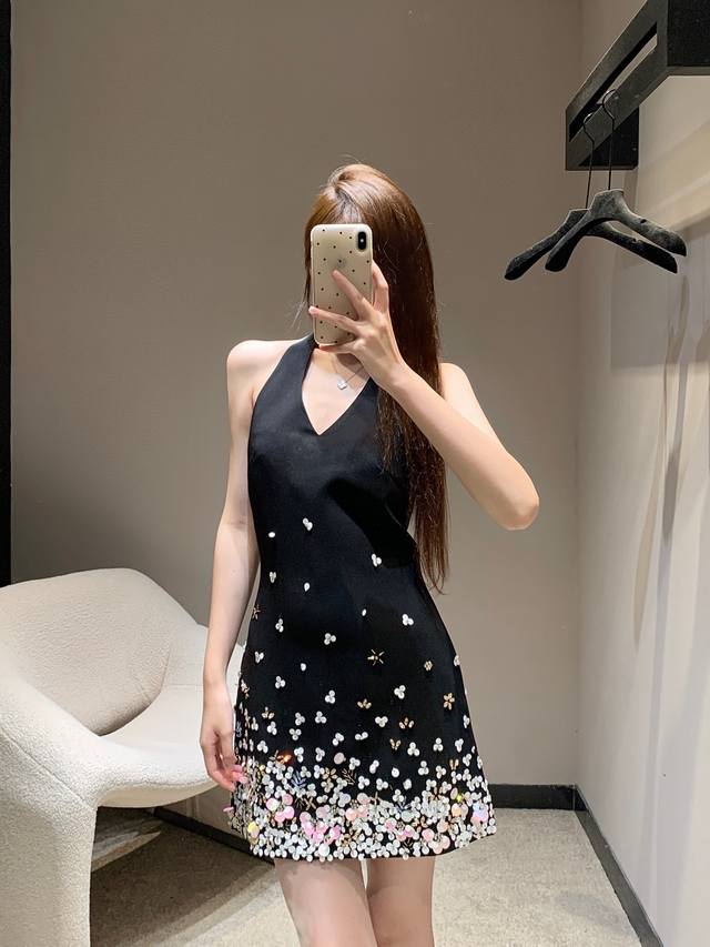 Miumi* 25Ss Spring and Summer new pure handmade beaded halter neck backless little black dress | Exclusive high version! The backless design is carefully tailored, and the waist-cut slim fit makes the upper body look very thin. The temperament is elegant, modern and playful, and it is a must-have high-end item for white, rich and beautiful women! The workmanship quality depends on the details. Available now SML