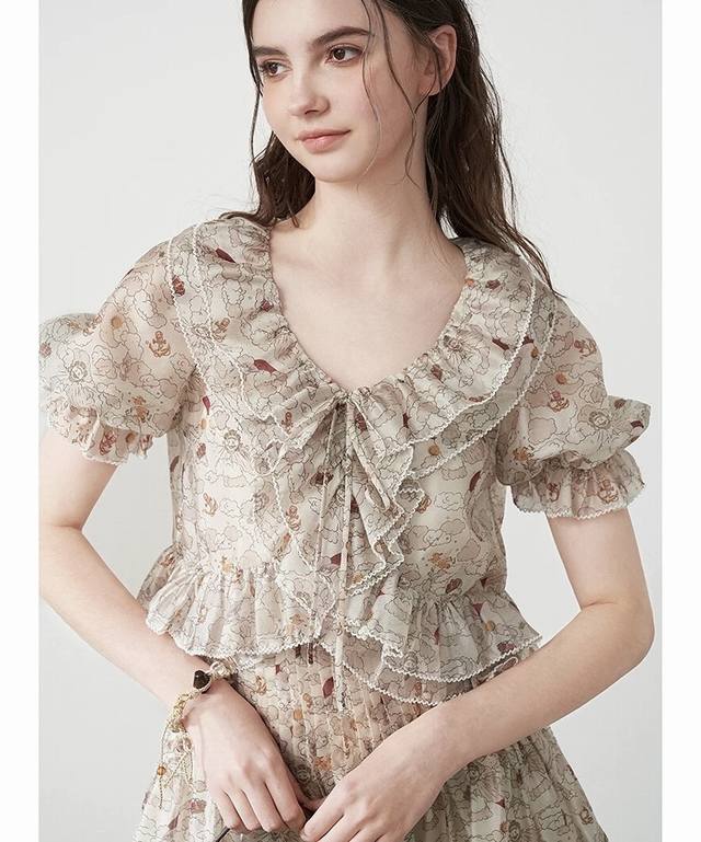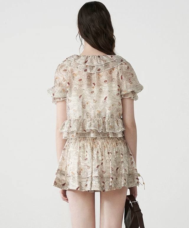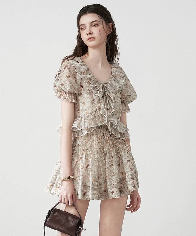 Miumi* Summer New Arrivals! High-end custom French floral print, sweet and stylish suit! A ruffled, short, V-neck, puff-sleeved top with a solid-color camisole underneath and a high-waisted, slim-fitting miniskirt with pleats! Size S: Chest 88cm, Sleeve 29cm, Length 42cm; Underwear 88cm, Length 27cm; Waist 66cm, Length 35cm (excluding straps).