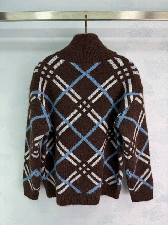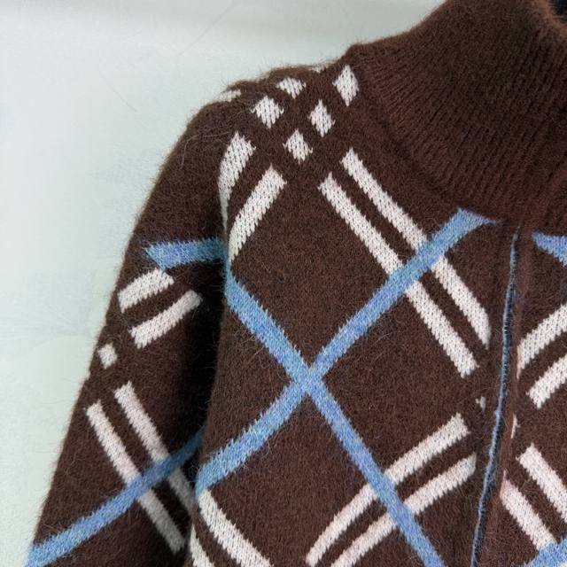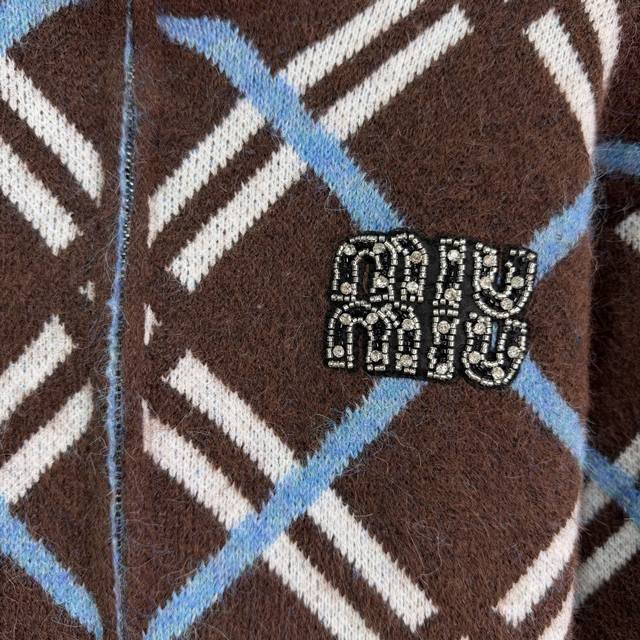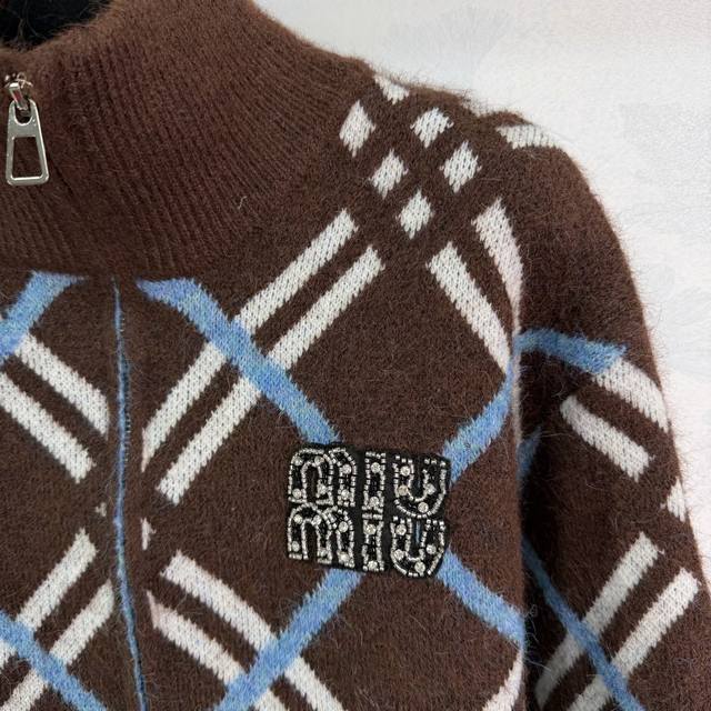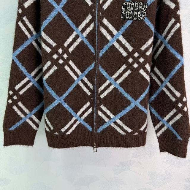 Miumi*2025 Autumn/Winter New Plaid Stand Collar Knit Cardigan! Made with custom wool yarn, this cardigan boasts a delicate, comfortable, and easy-to-wear feel. The stand collar and contrasting plaid pattern throughout, combined with the highly elastic fabric, flatter the figure and create a slimming effect. The chest is adorned with a wheat-ear-inspired logo, showcasing the brand's style. A versatile piece suitable for all ages and skin tones, it offers a relaxed, vacation-ready look and is perfect for a youthful and fashionable style! Available in 1 color and 3 sizes: S, M, L, T226B, DDD