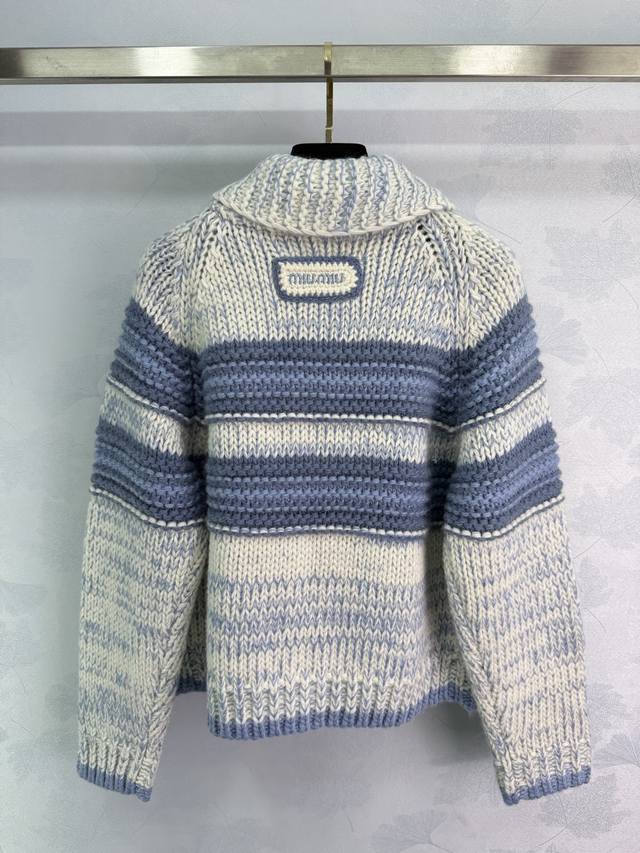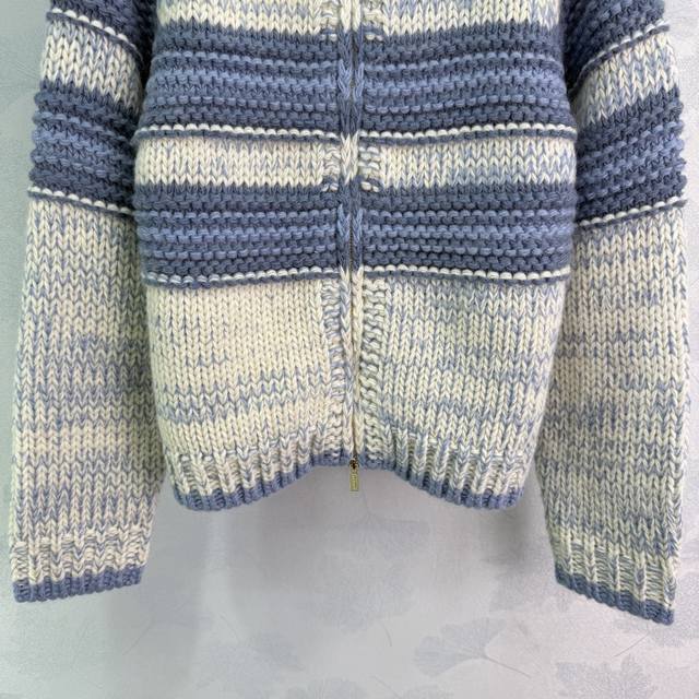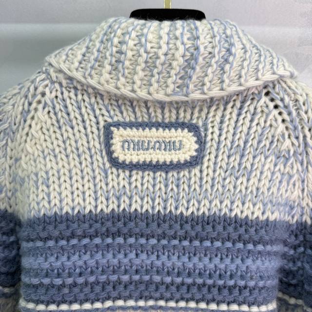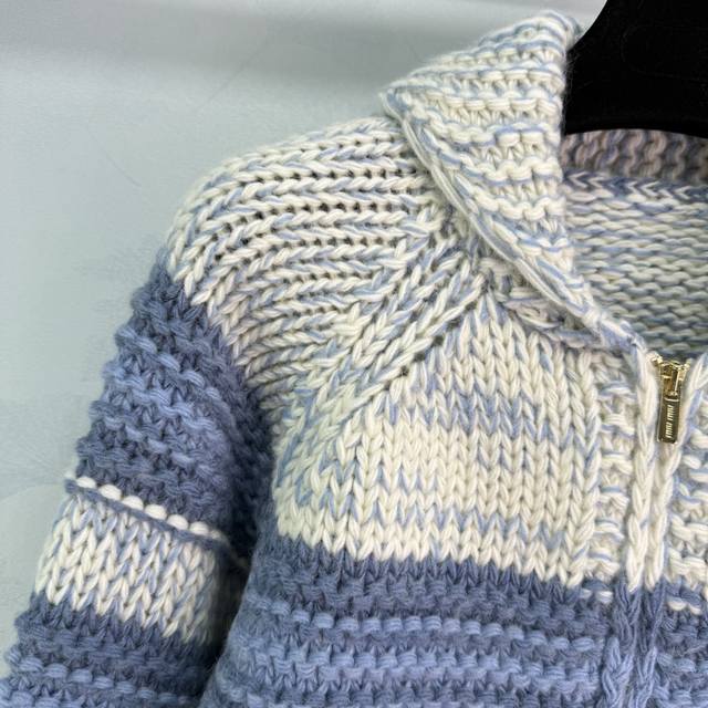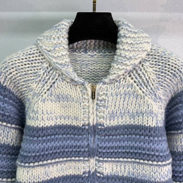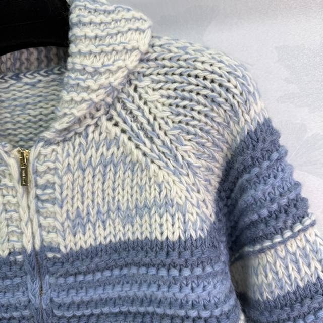 Miumi*2025 Autumn/Winter New Style Collared Zipper Cardigan, Custom Yb Wool Knit Material, Soft, Thick, Skin-friendly, Loose Cardigan Cut, Stand Collar, Turn-down Collar, Two-way Wear Design, Dark-colored Trimmed Hem and Cuffs, Two-way Zipper for Flexible Slits, Warm and Windproof, Simple and Stylish, Various Cable Knit Decorations, Two-tone Interwoven Pattern on the Chest Extending to the Arms Adds a Sense of Layering, Indispensable Letter Embroidery on the Back Enhances the Sophistication, Stylish and Chic! 1 Color, 3 Sizes: S, M, L, T2, 26, B,