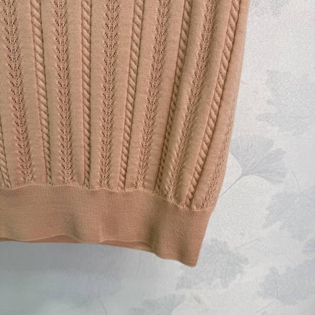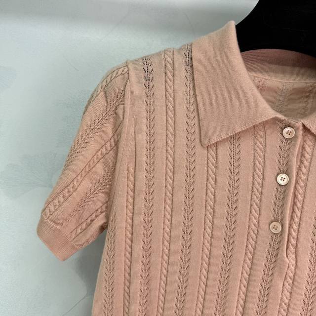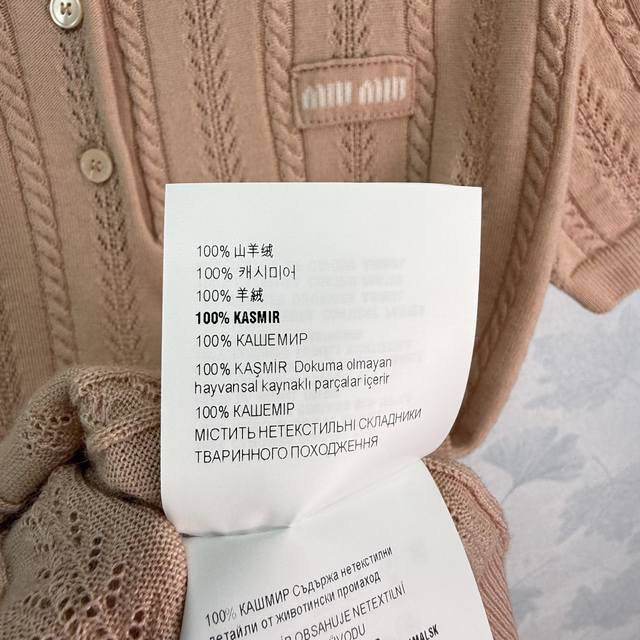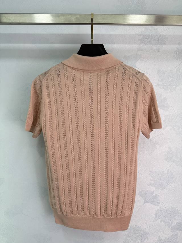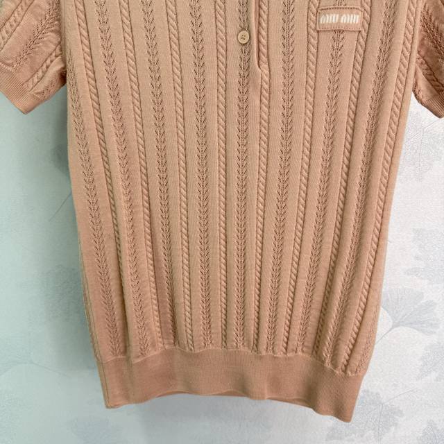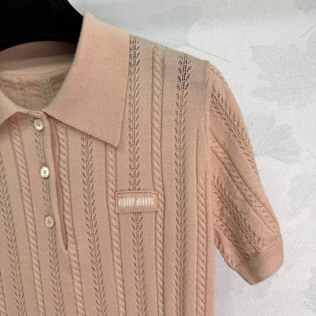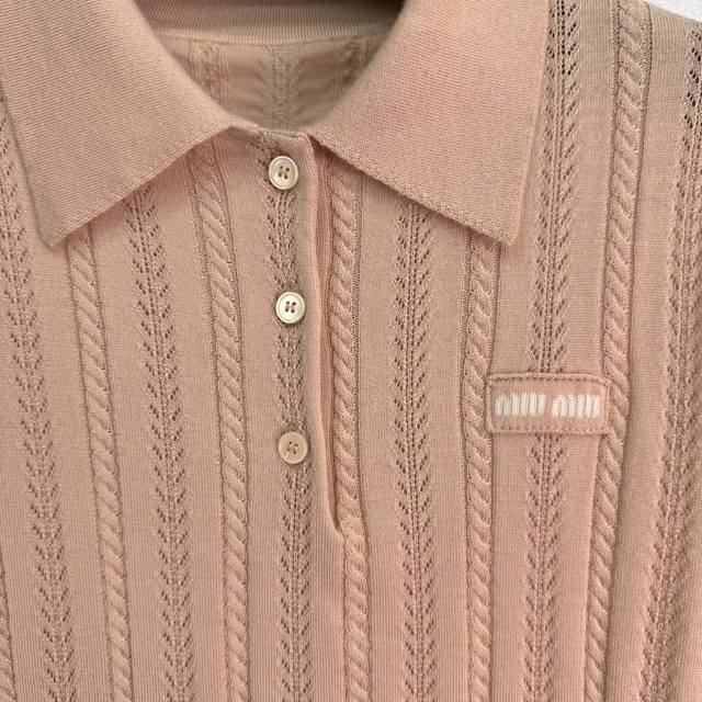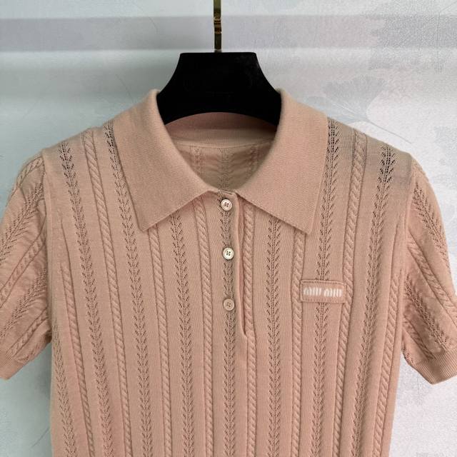 Miumi*2025 Early Fall new hollow knit lapel short-sleeve top! Custom-woven from imported wool blended yarn for a premium, stylish look. This knit lapel, half-open placket short-sleeve top features a woven, hollow crochet pattern throughout, highlighting the premium feel. The threaded design at the neckline, cuffs, and hem creates a slimming silhouette that's comfortable and relaxed. The letter logo on the chest accentuates this effortlessly stylish look! 1 color, 3 sizes Sml