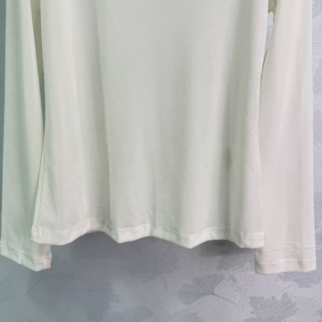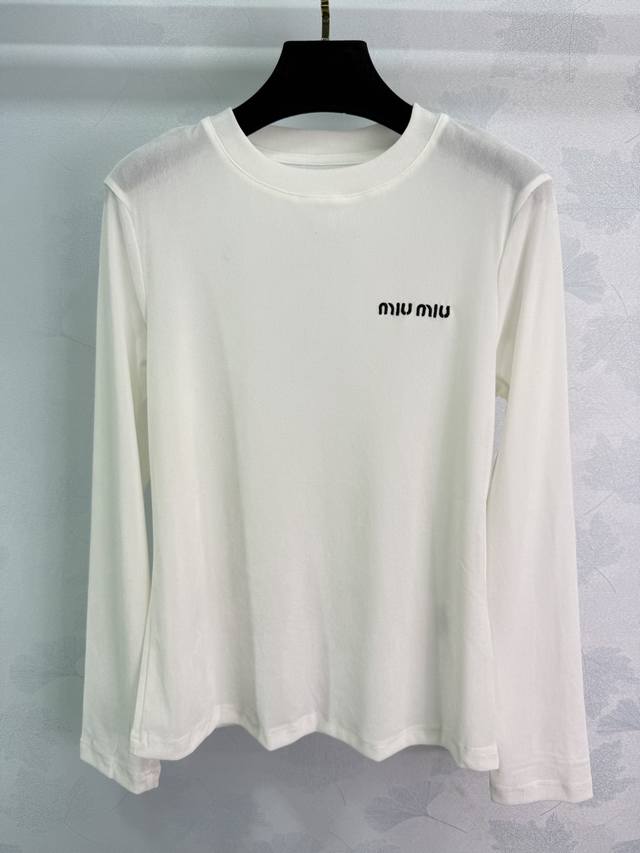 Miumi*2025 Early Fall new slim-fit crew neck base shirt! Custom-made imported material, comfortable and stretchy, round neck, long sleeves, cropped neckline, threaded hem, all-over solid color, versatile and durable, signature chest logo embellishment adds a touch of luxury, slim fit, tailored to the body, slimming, sophisticated and elegant. Perfect for fall and winter inner wear, daily commuting and leisure, 3 colors and 3 sizes (Sml