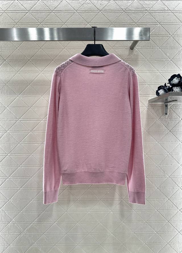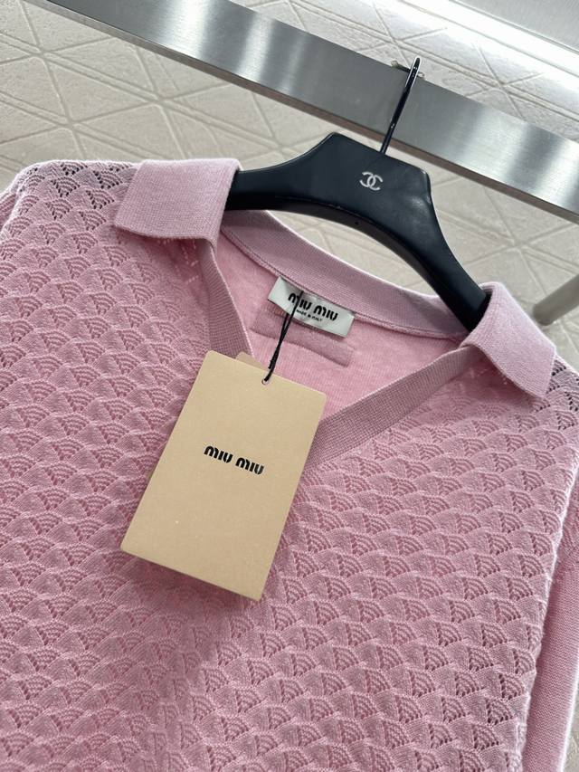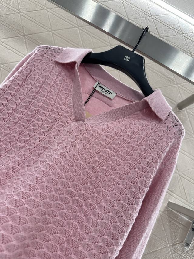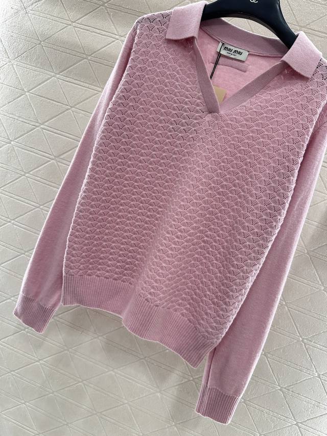 Miumi*2025 New Arrival DDD Collared Half-Open Sweater DDD Made with custom Yb wool yarn, comfortable and warm, with a superior texture. The collared knit sweater features a V-neck design for a relaxed look. The hem and cuffs are finished with knitted ribbed trim, creating a sophisticated and stylish overall look. The body is covered in fan-shaped scale patterns, contrasting with the plain knit sleeves for added depth and visual interest. This adds a stylish touch to a classic, versatile piece, making it incredibly chic. Custom fabrics and accessories, please look for the high-quality version in 2 colors. DDD
