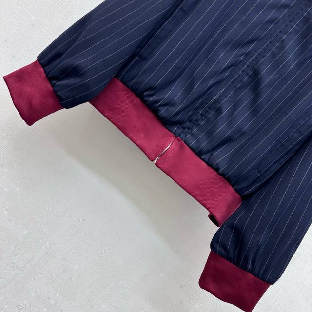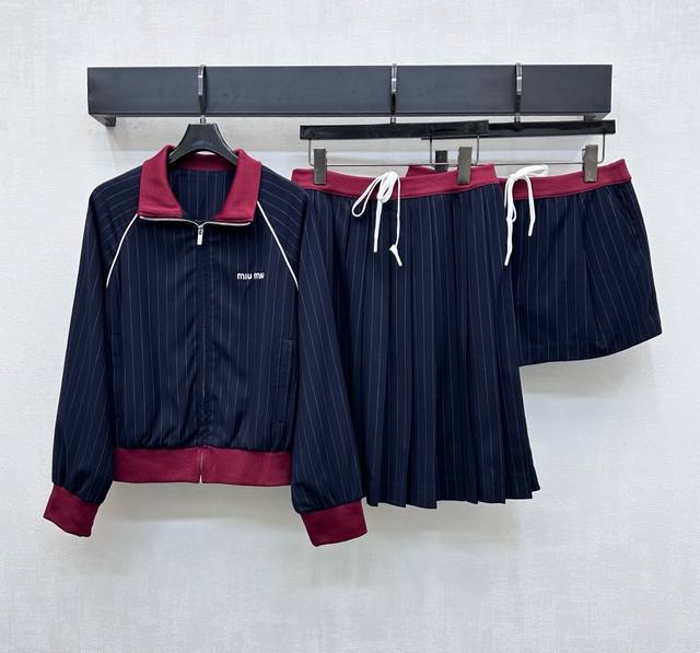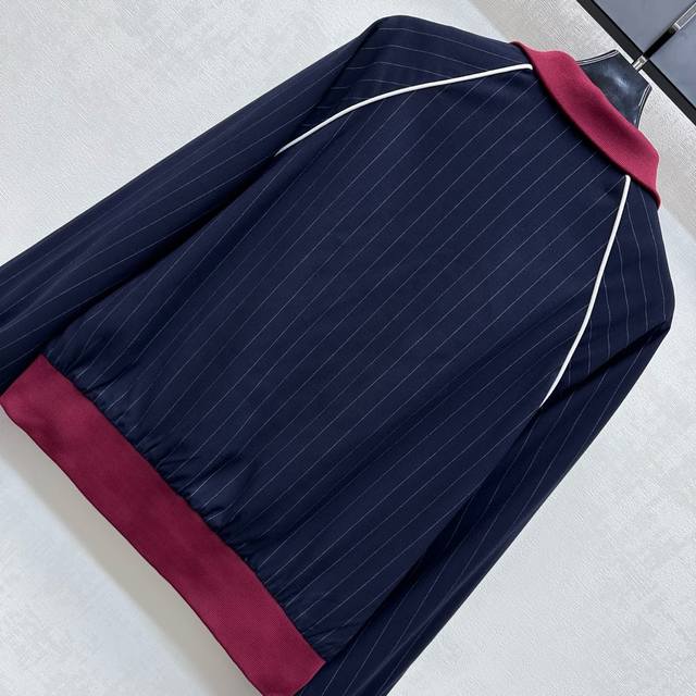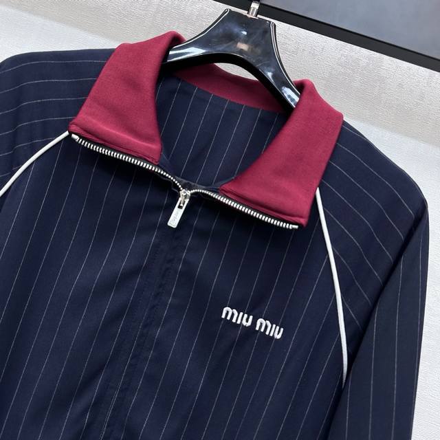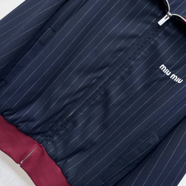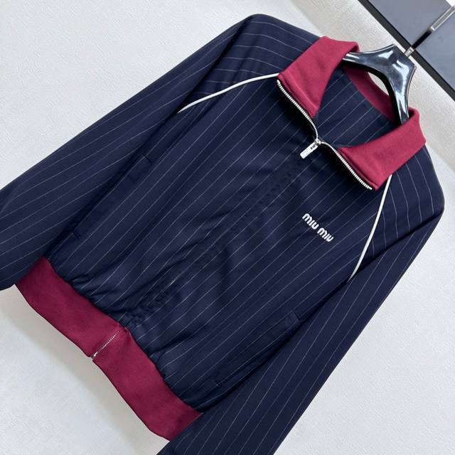 Miumi*2025 New Arrival: Custom-Made Spliced Jacket Made of Yb Imported Rayon, High-Quality and Lustrous. Stripes throughout, accented with contrasting colors on the collar, hem, and cuffs. Threaded stitching adds a layered look. The iconic embroidered logo accents the chest, highlighting the brand's signature style. Fabric and Accessories: Development Zone. Lapel jacket and coat. Paired with skirts and pants from the same collection for a complete, relaxed, and preppy look. Meets a variety of commuting and dating needs.