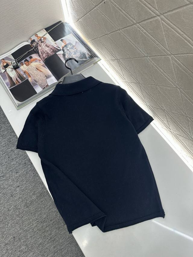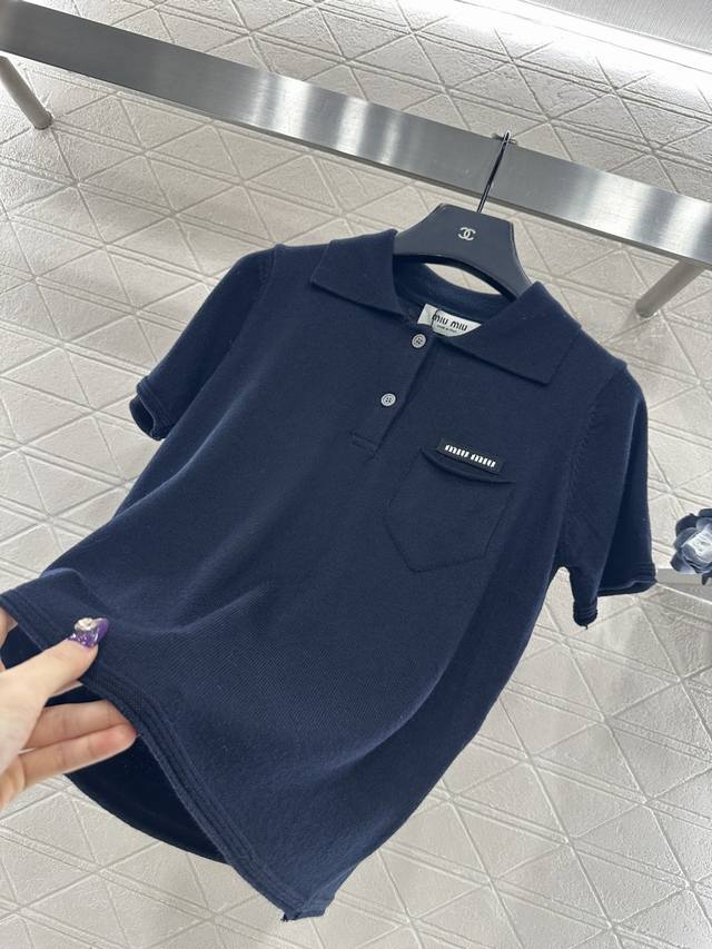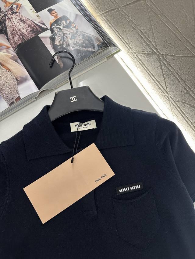 Miumi*2025 New Arrival DDD Half-Open Collar Knit Short-Sleeve T-Shirt DDD Made with custom Yb wool yarn, fine knit, soft and comfortable against the skin. Features a half-open collar knit short-sleeve design, a large single chest pocket adorned with a logo, highlighting the brand's style. The three-dimensional cut creates a fashionable look, adding depth and texture. Stylish and chic, perfect for wearing alone or layering. Custom fabrics and accessories, high-quality version. Available in black and white. DDD