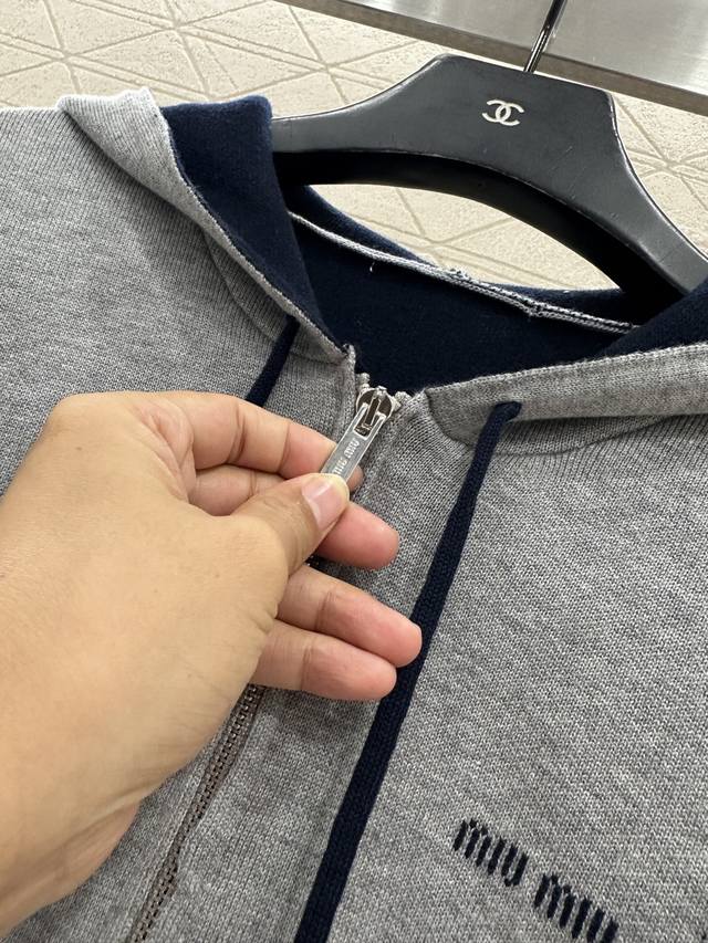 Miumi*2025 New Arrival Ddd Hooded Letter Mid-Length Coat Ddd Custom Yb wool yarn weave, high-quality texture, smooth drape and stylish, hooded zip-up mid-length knit cardigan cut, two-way zip-up opening for a stronger sense of fashion, high-grade gray outer layer and navy blue inner layer contrast, full of luxury, chest logo decoration for rich layers, mid-length loose fit, fashionable and warm for autumn and winter layering. Custom fabric and accessories, look for high-quality gray DDD