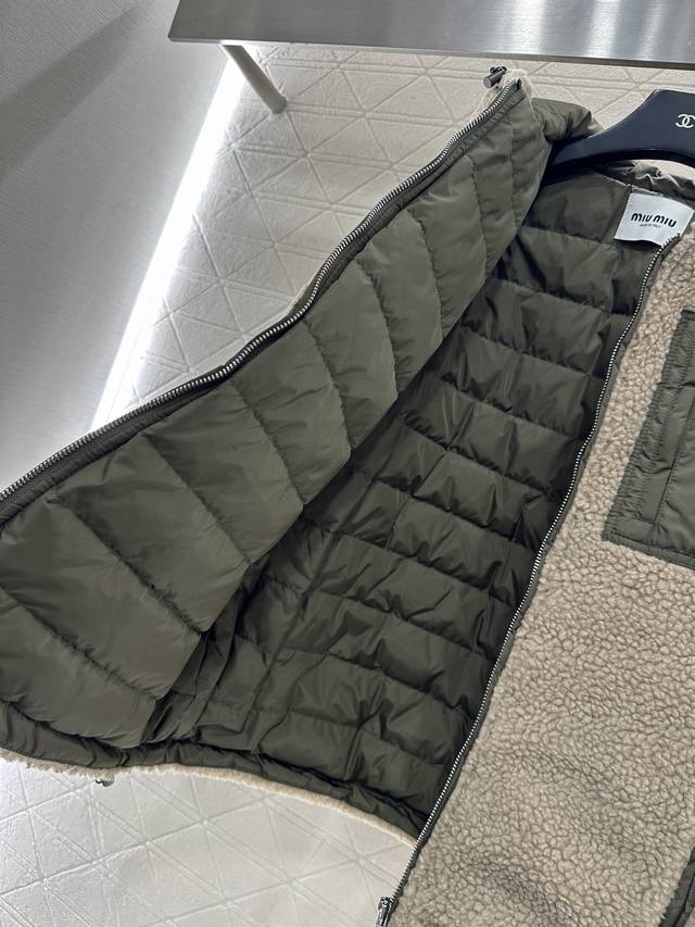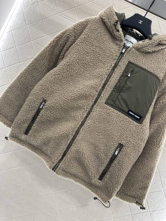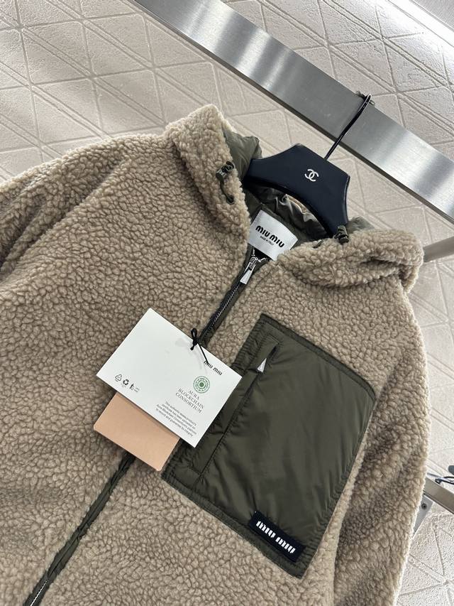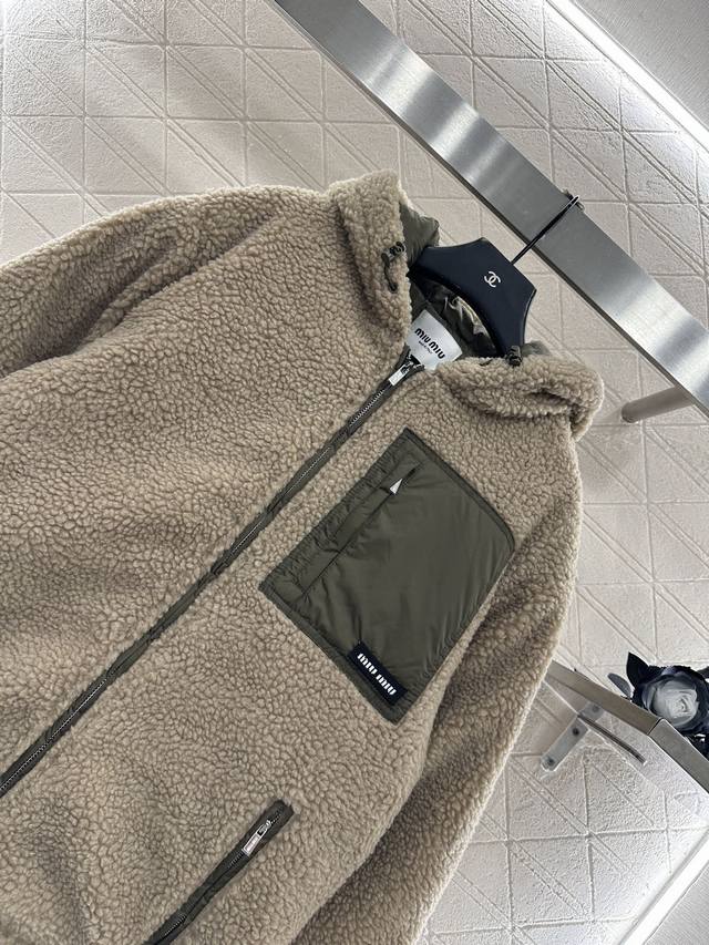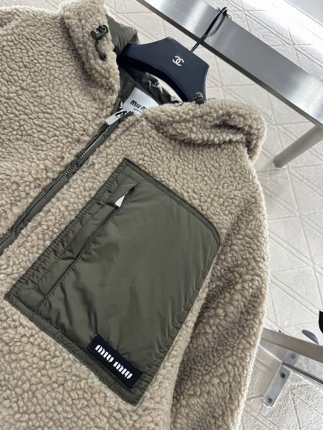 Miumi*2025 New Arrival DDD Hooded Teddy Lambswool Down Jacket DDD Custom Yb Teddy lambswool material, waterproof nylon lining, perfectly combining windproof and cold protection, white goose down filling, lightweight and warm, hooded zip-up jacket design, single nylon pocket with fabric patch letter logo embellishment, showcasing brand style, unique sauerkraut green adds a touch of sophistication, fashionable and stylish, suitable for more occasions and personal styles. Customized fabrics and accessories, look for high-quality versions. DDD