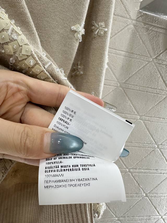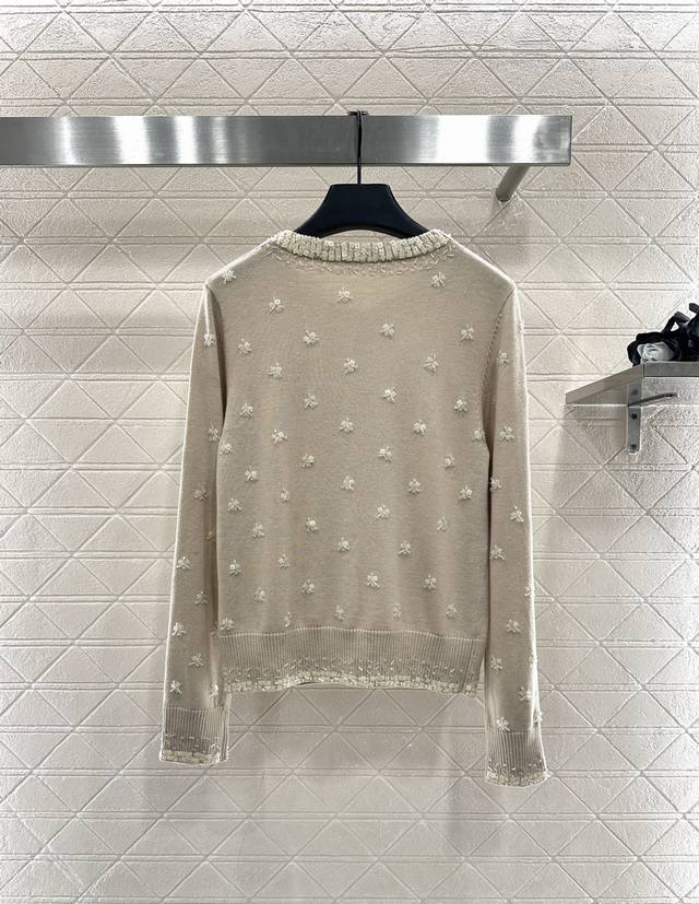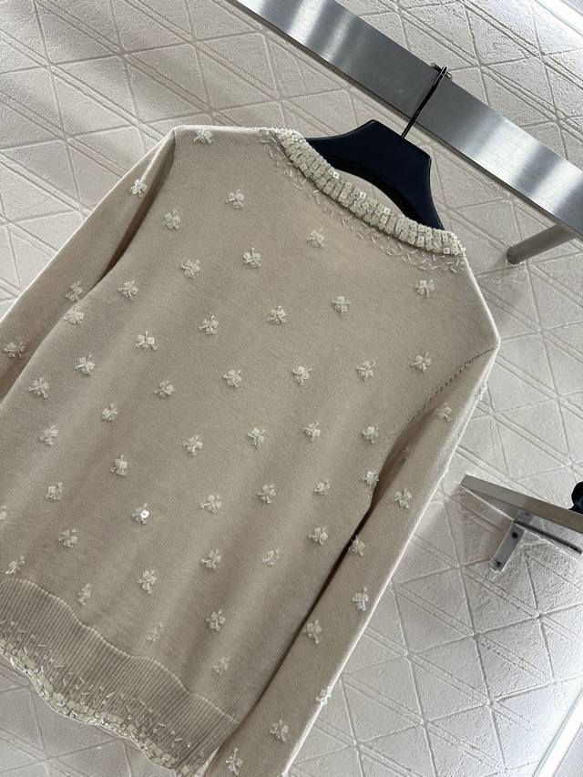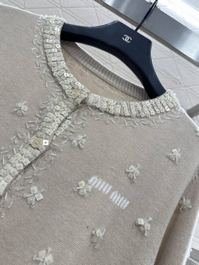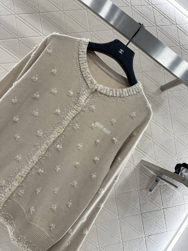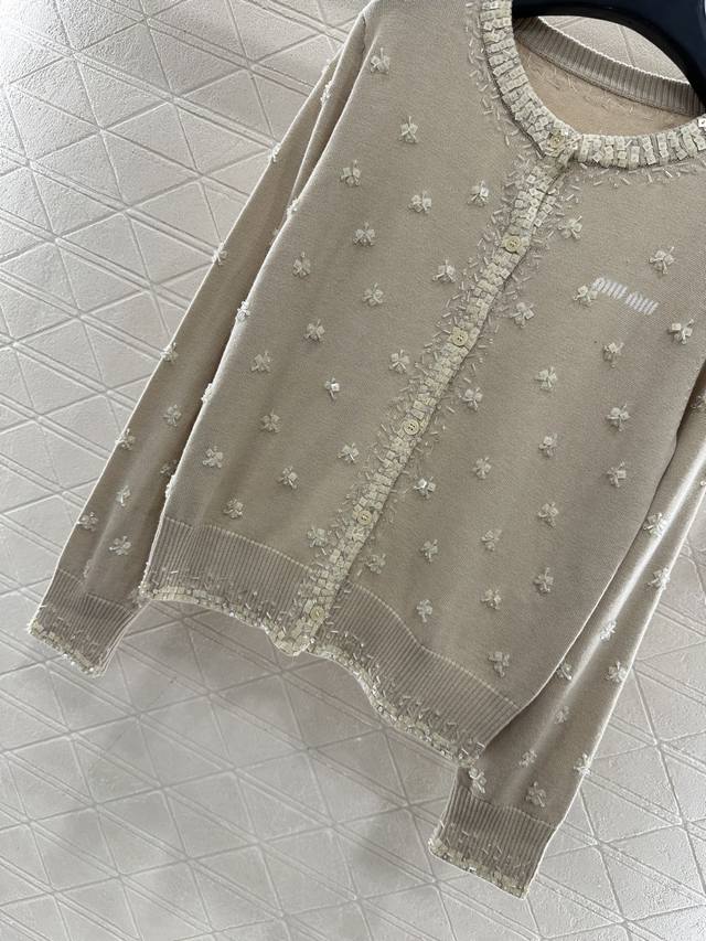 Miumi*2025 New Arrival DDD Sequined Beaded Knit Cardigan DDD Made with custom Yb wool yarn, fine knit for a clear wool-like texture, comfortable and skin-friendly. Round neck, button-down shoulders, and a logo logo on the chest highlight the style. The neckline extends to the front placket and cuffs, outlined with dense beading. Sequins and beads are strategically placed on both sides of the body, forming a floral pattern that reflects glamorous light, creating a luxurious and relaxed feel. Ribbed edges at the collar, cuffs, and hem provide excellent elasticity. The rich color scheme adds a sense of layering, and the flattering fit is forgiving and youthful. Custom fabrics and accessories, high-quality version DDD