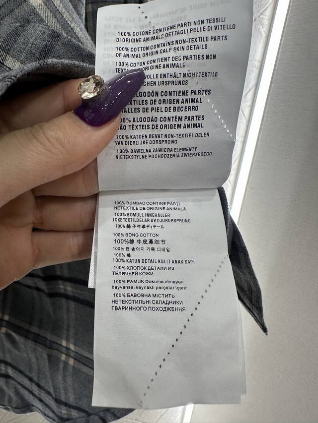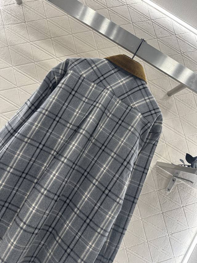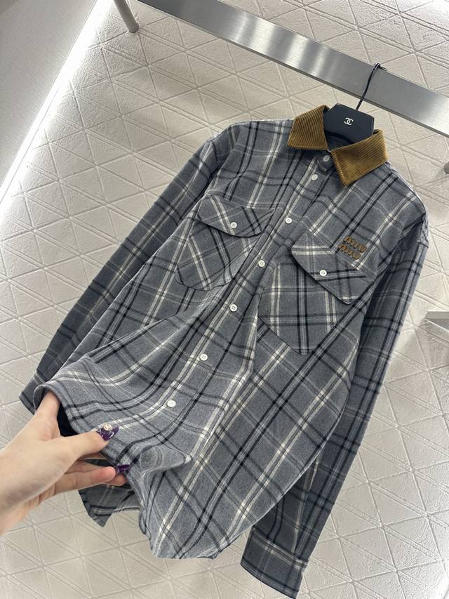 Miumi*2025 New Arrival DDD Striped and Checkered Shirt DDD Made entirely of 100% cotton wool, soft and comfortable to the touch, stylish and chic. The oversized shirt features a corduroy collar with contrasting colors, creating a striking contrast. The grey checkered pattern adds a touch of simplicity and style. A three-dimensional logo on the flap pocket adds a subtle detail, effortlessly showcasing a preppy style. Paired with a matching skirt, the look is youthful and fashionable, presenting a British preppy style. Custom fabrics and accessories, please ensure you choose the high-quality version. DDD