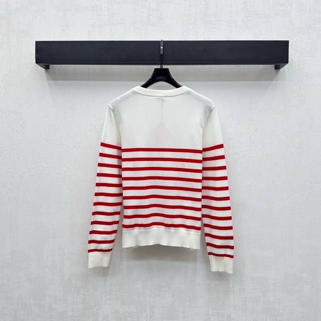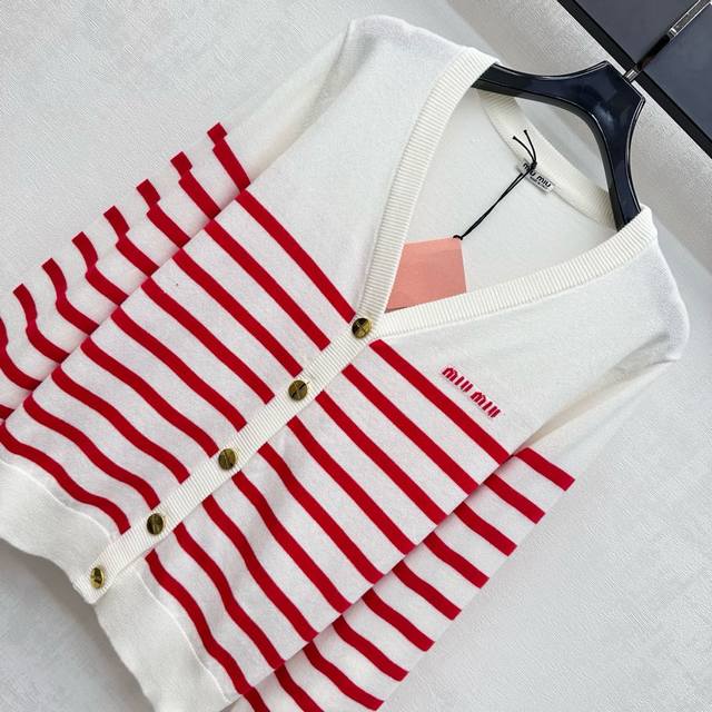 Miumi*2025 New Arrival Striped Knit Cardigan Custom Made Yb Imported Wool Knit Material Soft, Comfortable, Stylish, Slimming Neckline Extends to the Hem with Threaded Trim Echoing the Cuffs for Layered Design. Signature Heavy Metal Engraved Buttons Adjust the Front. Signature Embroidered Logo on the Chest Highlights the Brand's Stylish Design. Fabric and Accessories Developed. V-Neck Knit Cardigan Cut for a Simple and Elegant Look, Perfect for Layering in Fall and Winter. High-End Version, 2 Colors.