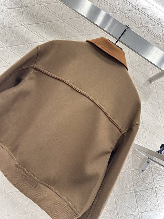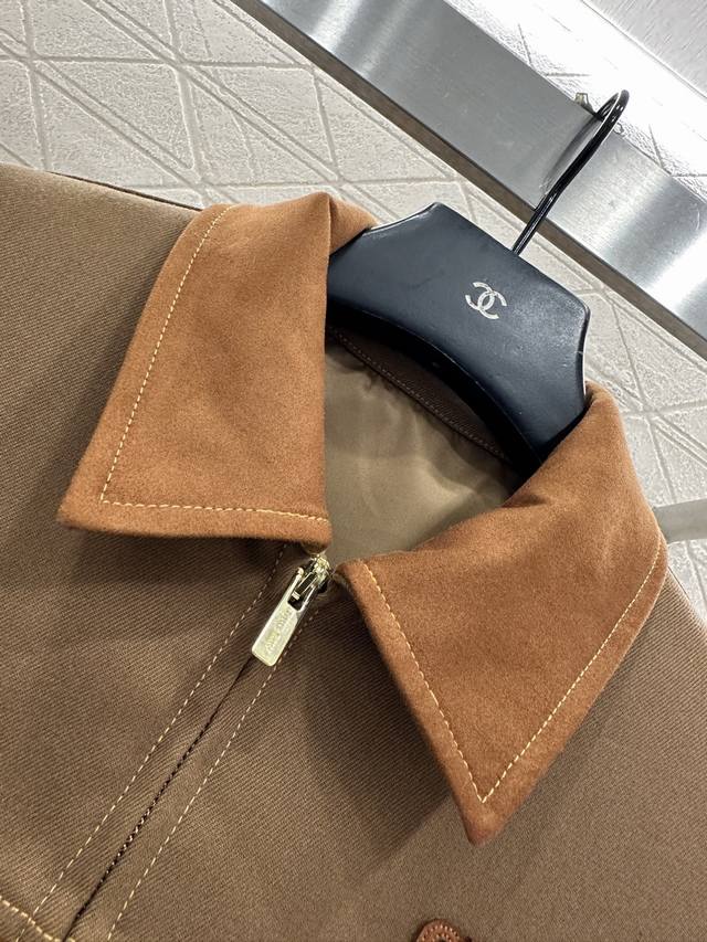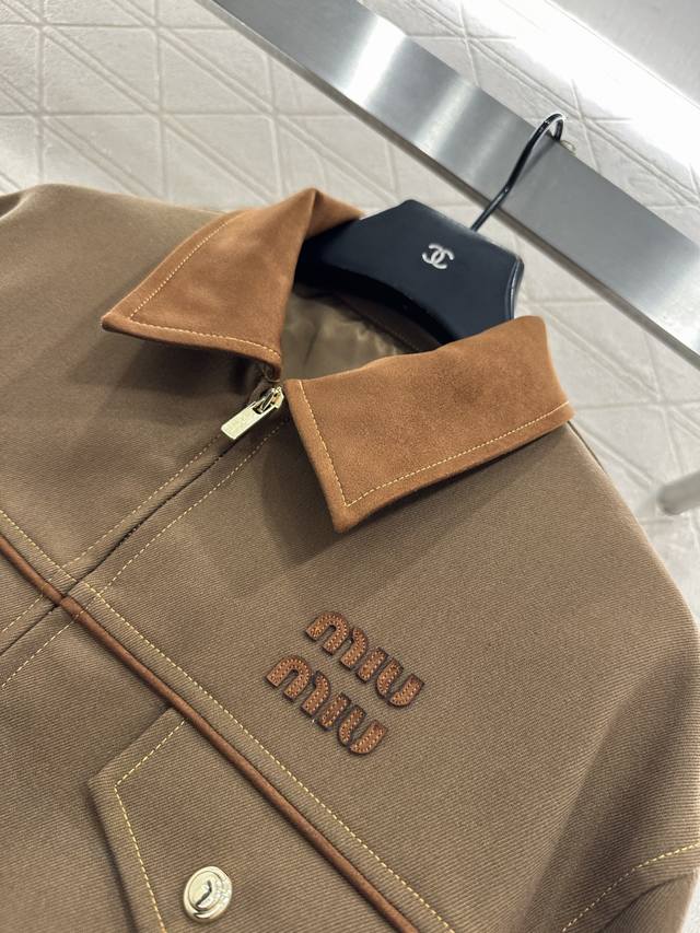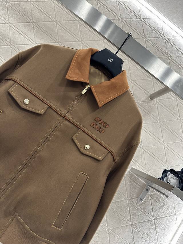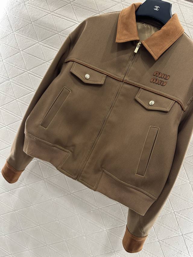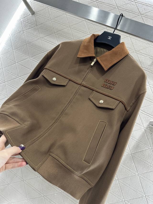 Miumi*2025 New Arrival Ddd Suede Collar Zip-Up Jacket Ddd Custom Yb Imported Twill Cotton Suede Material, Delicate Texture, Sturdy and Stylish, Collared Zip-Up Jacket Style, Cocoon-Shaped Hem, Excellent Windproof and Cold Protection, Color Contrast Between the Collar and Body Fabric, Symmetrical Flap Pockets Outline the Look, Durable and Versatile, Side Slanted Pockets for Hand Warmth and Practicality, Rich Layers, Adding Visual Highlights to the Regular Style, Paired with Contrasting Letter Decoration on the Chest, Showcasing a Casual Workwear High Street Fashion Style. Custom Fabrics and Accessories, High-Version, Two Colors: Brown and Navy Blue. DDD