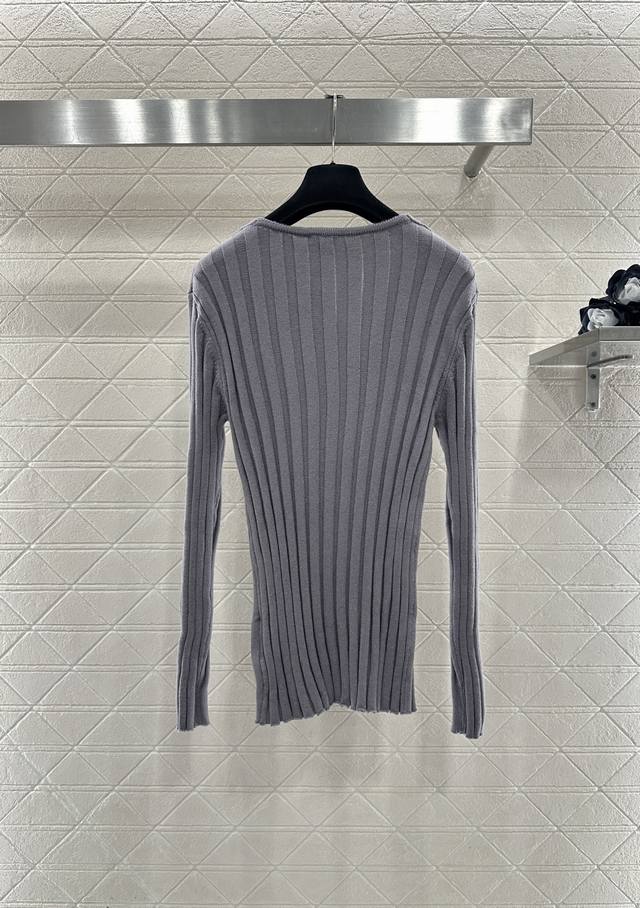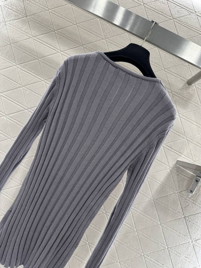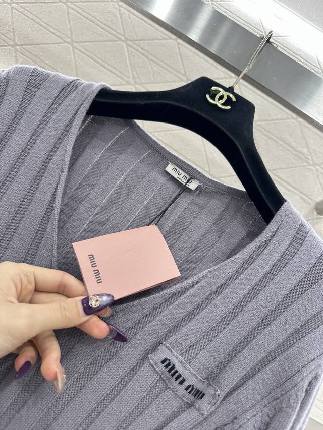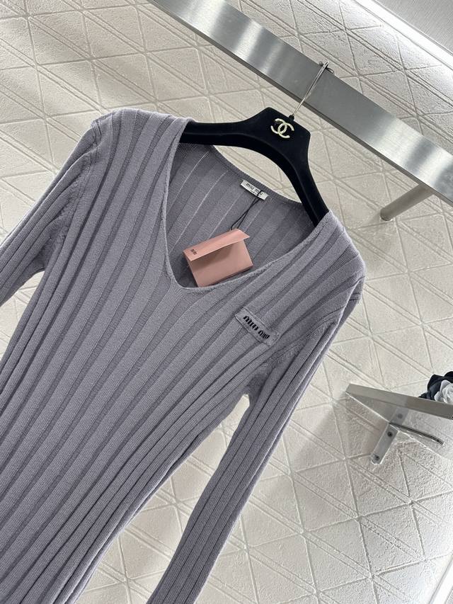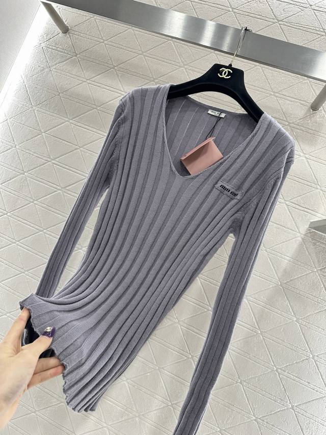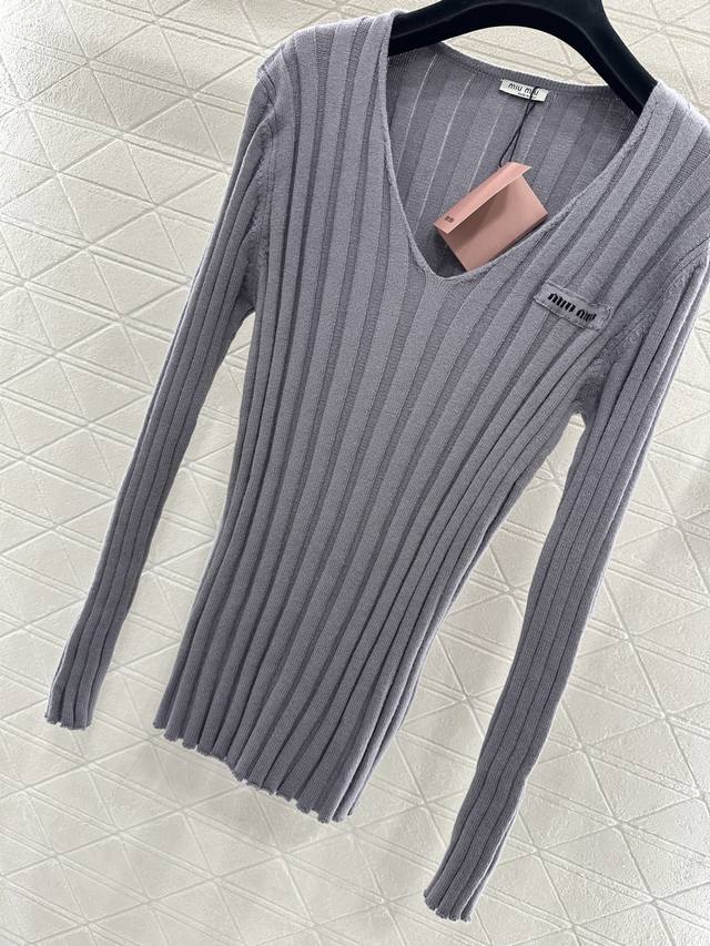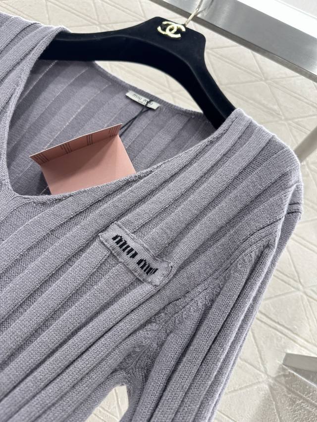 Miumi*2025 New Arrival Ddd V-Neck Slim Fit Knit Sweater Ddd Custom Yb wool yarn knitting, high-quality texture, stretchy and comfortable. The V-neck slim fit knit sweater is highly elastic, hugging the body without looking bulky. The vertical ribbed texture is delicate and visually slimming, easily highlighting the perfect details and texture. The letter logo adorns the chest, exquisite and stylish, a perfect outfit for a youthful look. Custom fabric and accessories, look for the high-quality grey version. DDD