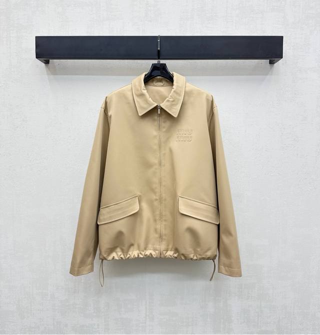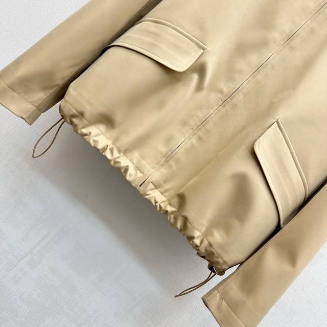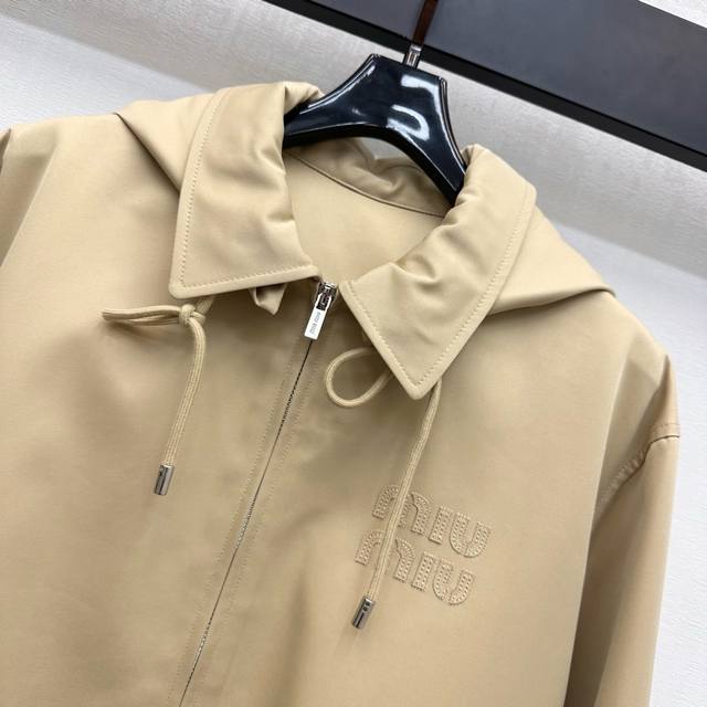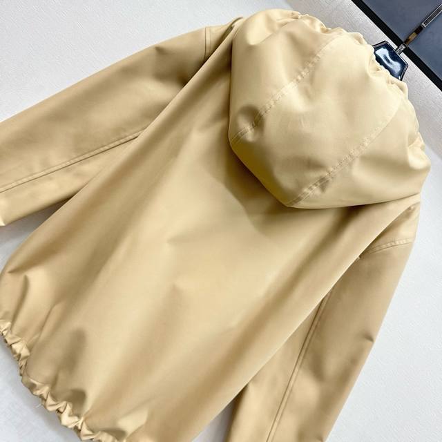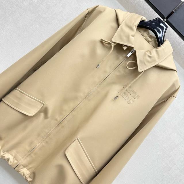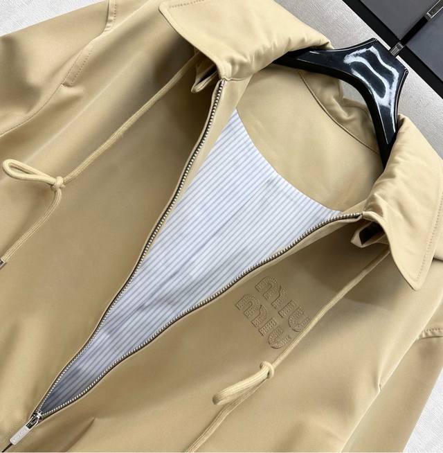Miumi*2025 new arrivals. Custom-made, hooded, drawstring jacket with a lapel. Yb imported trench coat. Crisp, stylish lining with blue and white stripes. Refreshing, artistically engraved lettering. Adjustable drawstring design. Symmetrical flap pockets add layered styling. A signature letter logo accents the chest, highlighting the brand's signature style. Developed fabrics and accessories. Hooded, zip-up jacket with a hood, creating an elegant silhouette. A must-have for both fashion and practicality. Perfect for everyday commuting, with a charming, British look.