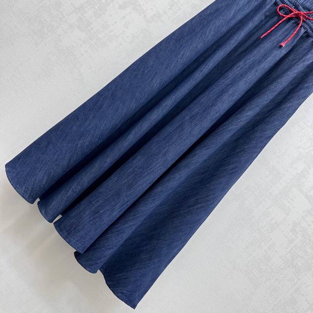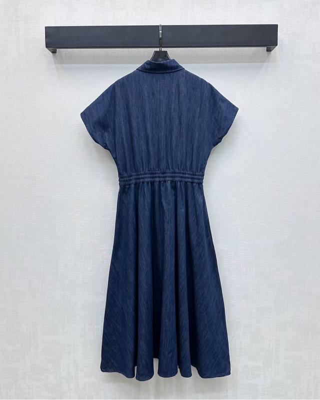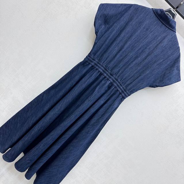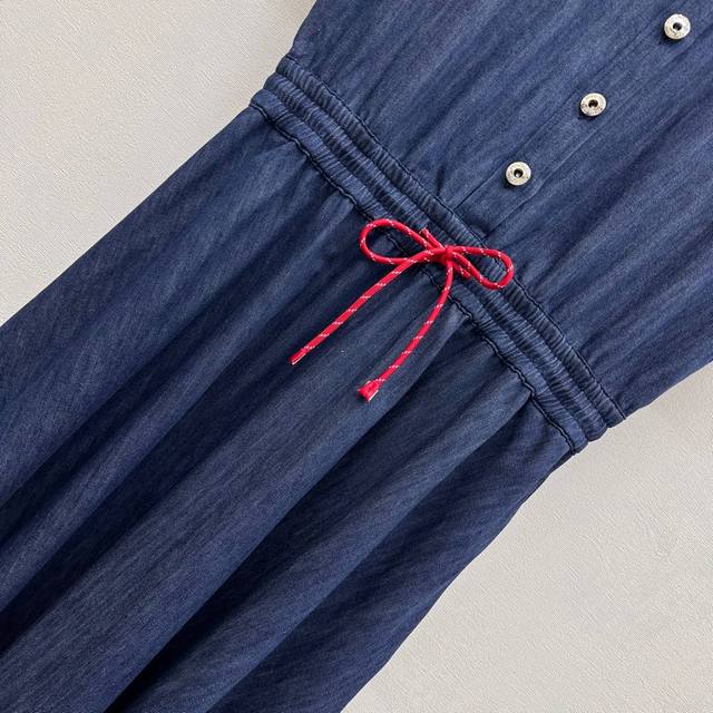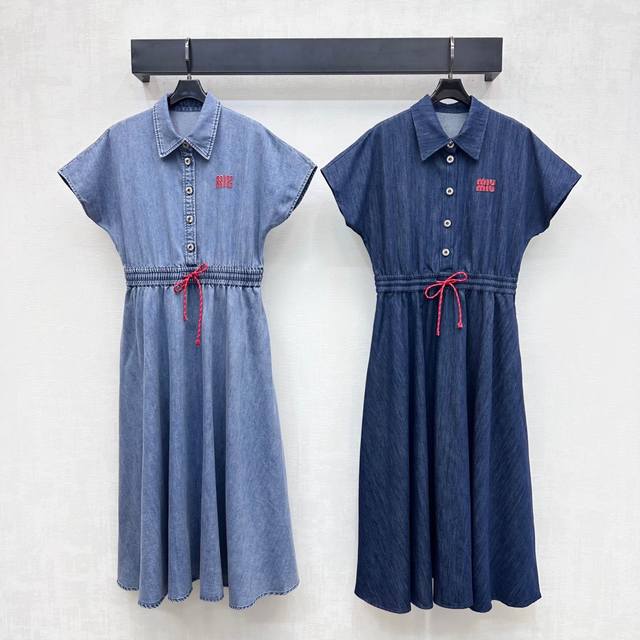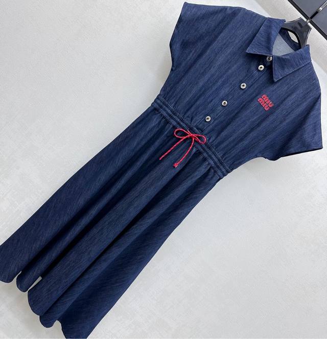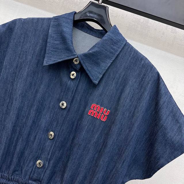 Miumi*2025 New Arrivals Wide-sleeved denim dress Customized Yb imported cotton denim material Comfortable and breathable Full of texture Decorated with half-open button for easy wearing and taking off The iconic letter logo decoration on the chest highlights the brand tone The skirt is pleated with elastic waistband Twisted color drawstring design modifies the waist and outlines the proportion to add layering to the shape The upper body presents a casual and lazy style of dressing Surface and auxiliary materials development Lapel short-sleeved dress tailoring Daily commuting outfit is colorful and fashionable
