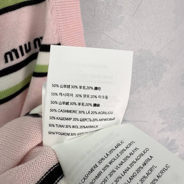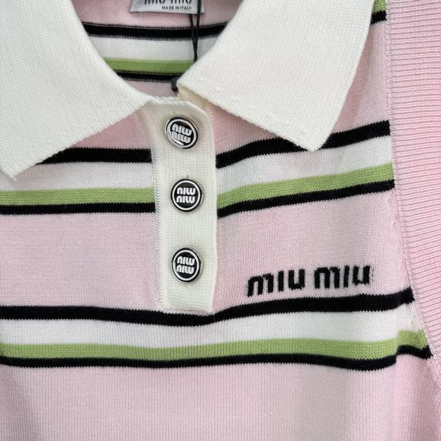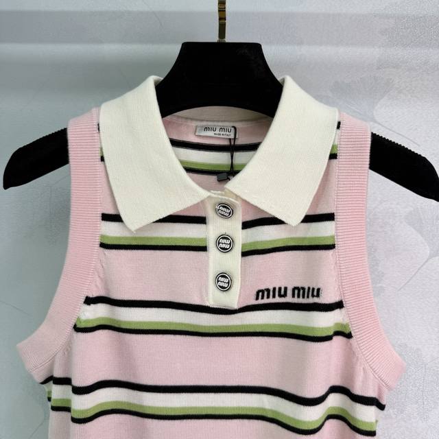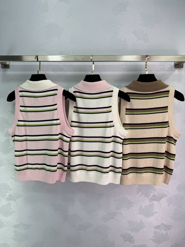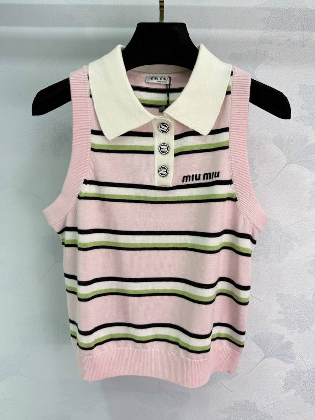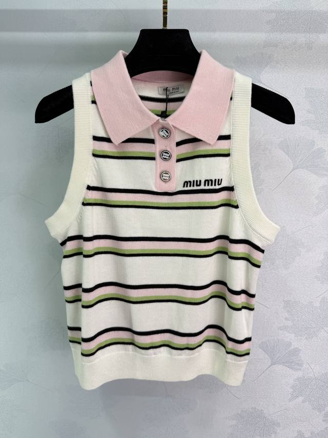 Miumi*2025 Spring and Summer latest series! Striped lapel knitted vest! Custom wool yarn weaving, delicate texture, breathable and comfortable, lapel button opening, free adjustment, skin-revealing, full-body stripes, contrasting colors, letter logo on the chest, brand tone, versatile style, not picky about age and skin color, suitable for age-reducing and fashionable style! 3 colors and 3 sizes Sml T226B