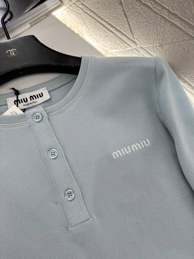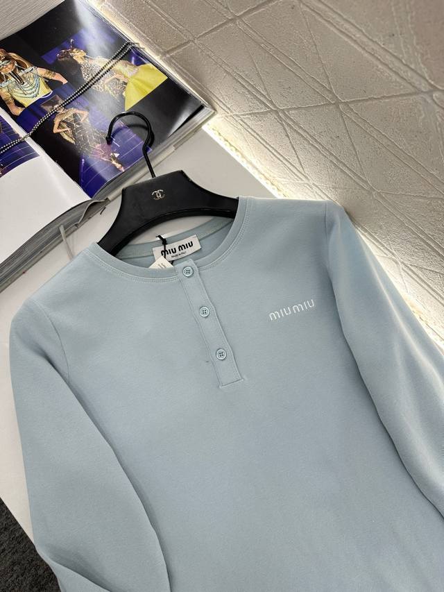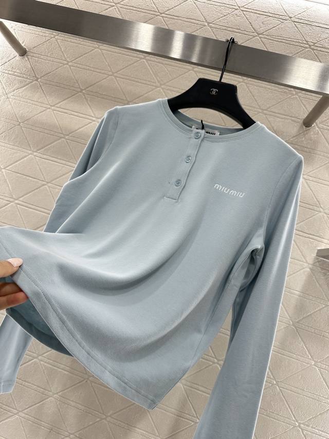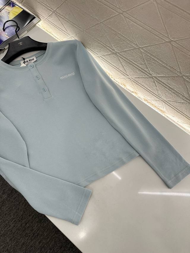 Miumi*2026 New Arrival Ddd 100% Cotton Stretch Top Ddd Custom Yb twill 100% cotton material, delicate texture, comfortable to wear, round neck cut, half-button opening at the front, adjustable to reveal the collarbone, visually slimming, single brand logo on the chest breaks the monotony and shows the brand's style, understated yet high-quality, exuding elegance, suitable for daily commuting. Customized fabric and accessories, look for high-quality version DDD