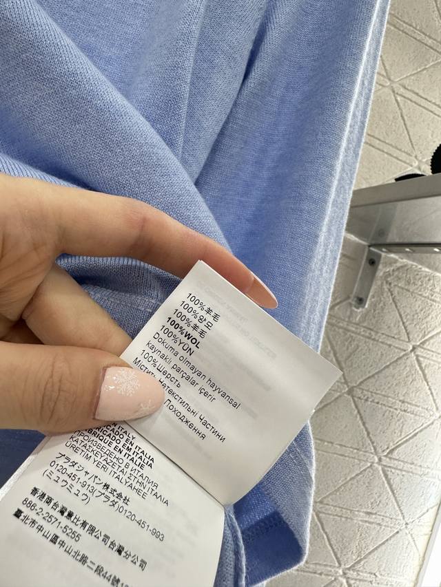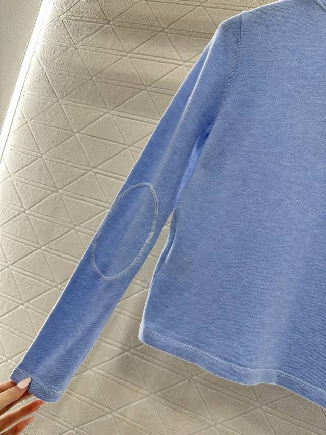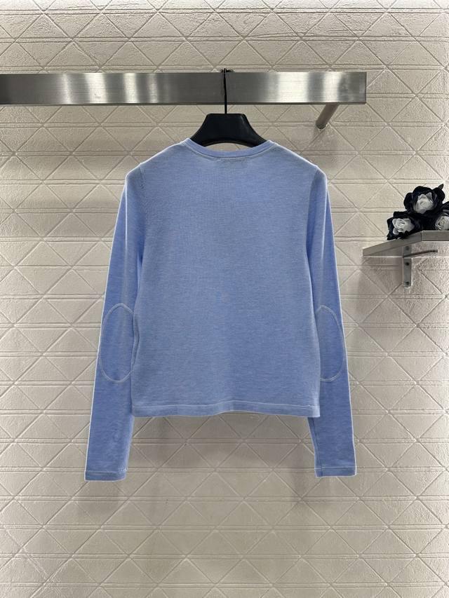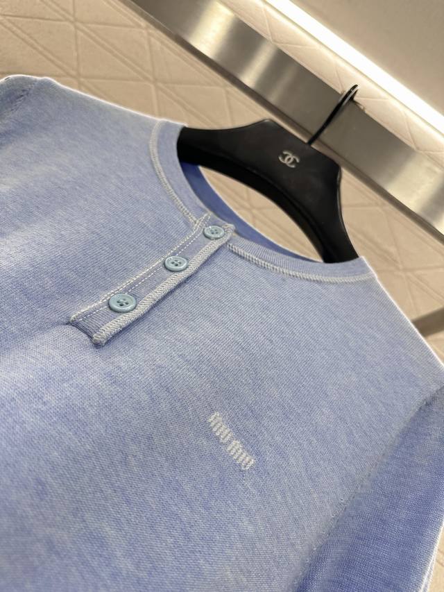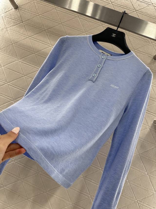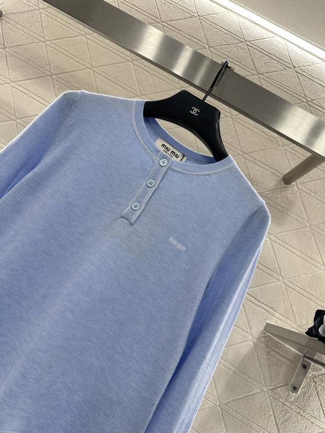 Miumi*2026 New Arrival Ddd Half-Open Knit Top Ddd Made with custom Yb wool yarn, soft and delicate, comfortable to wear. Round neck slim-fit top cut, half-open front button, adjustable to reveal the collarbone for a slimming effect. Single-sided brand logo on the chest, along with embroidered elbow details, breaks the monotony and showcases the brand's style. Understated yet sophisticated, it exudes elegance and is suitable for everyday wear and commuting. Custom fabric and accessories, look for the high-quality blue DDD.
