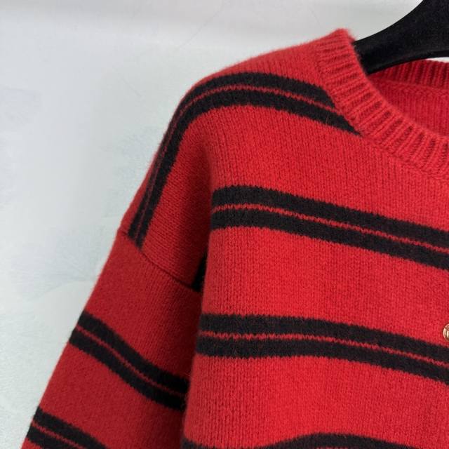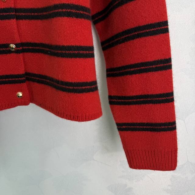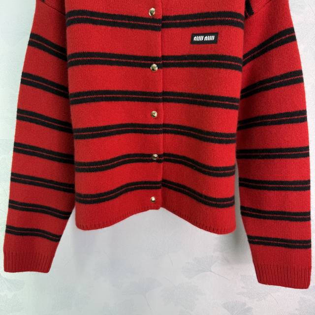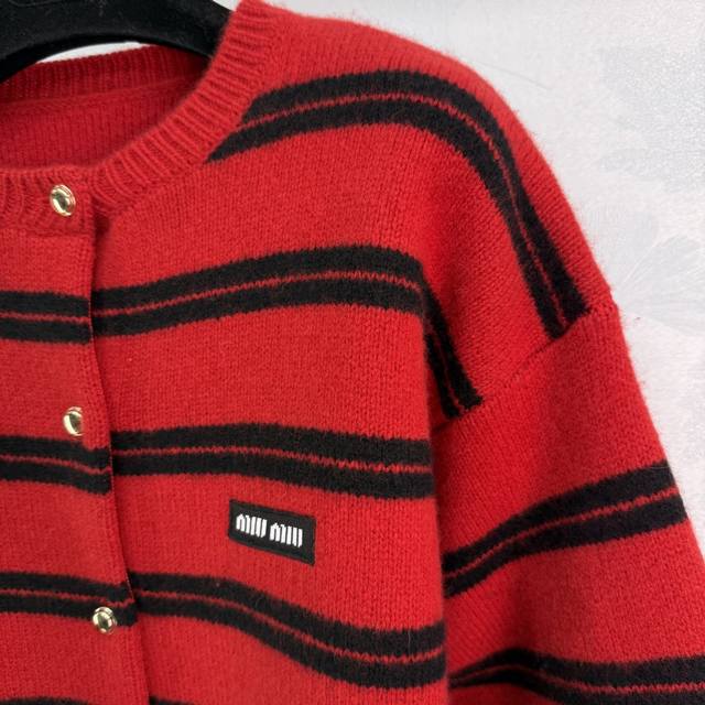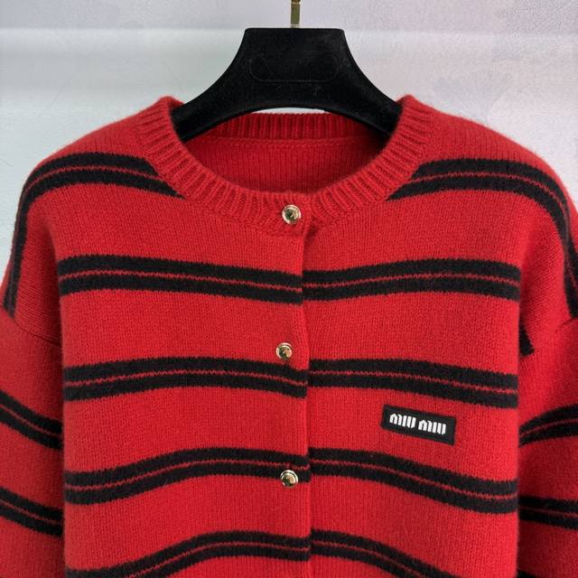 Miumi*25 Early Autumn new knitted round neck cardigan classic color stripe patchwork design letter logo seal embellishment metal button decoration high-end fashionable temperament size Sml. T226B