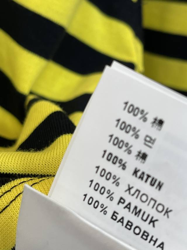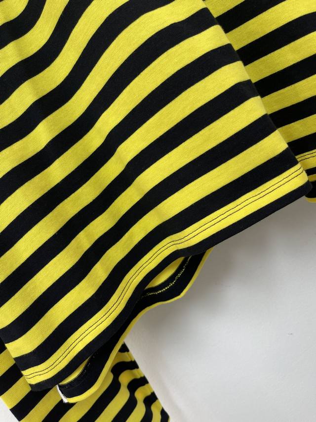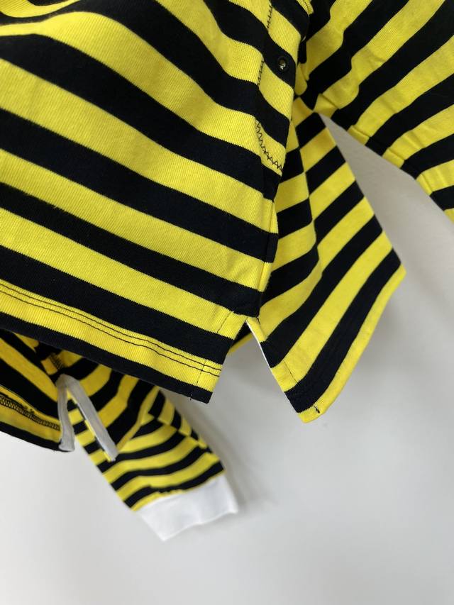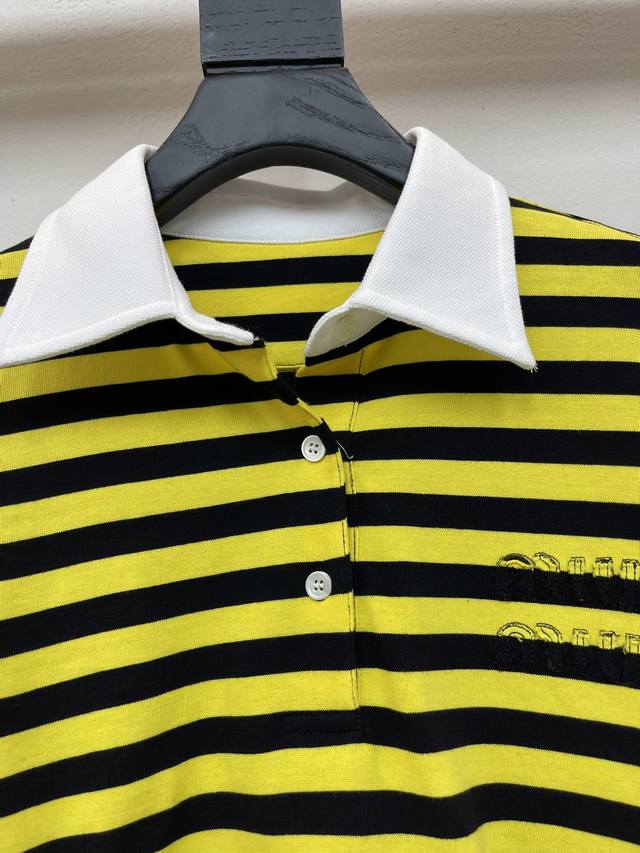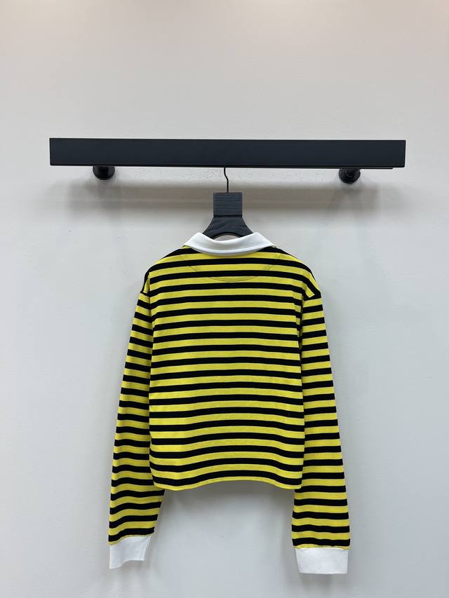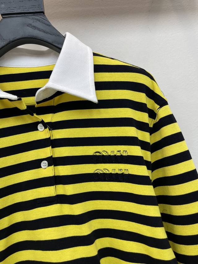 Miumi*25 Early Autumn new style lapel contrast striped long-sleeved top, custom-made with Yb original cotton weave, delicate texture, soft and comfortable. The long-sleeved top is tailored with buttons on the collar and half-open design. The pure white decoration on the cuffs and collar collimates with the yellow and black stripes on the body. The preppy style adds a youthful atmosphere. The letter logo embroidery on the chest highlights the brand's tone and shows off its youthful charm. A must-have for dating and commuting. Sml Aa