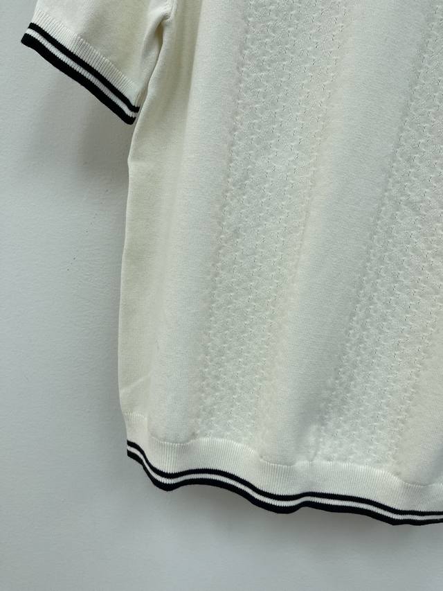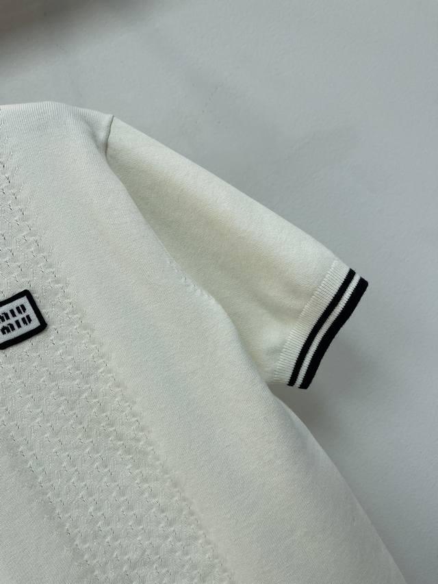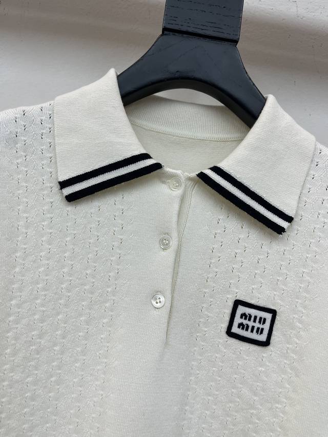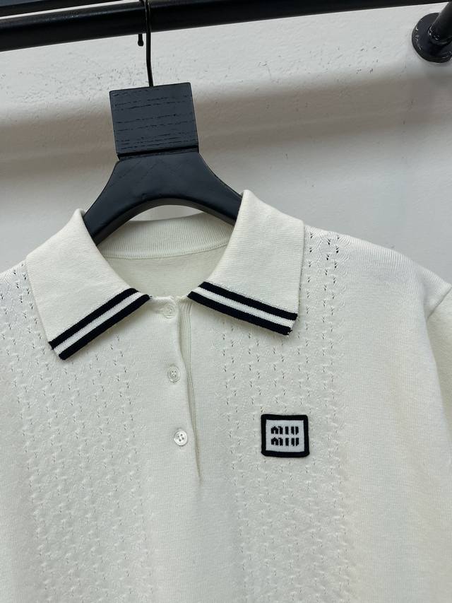 Miumi*25 Early Fall new preppy style polo collar, regular fit, short-sleeved knit top. This preppy cotton knit polo shirt showcases Miu Mi*'s unique personality, offering a casual yet artistic and comfortable feel. The boxy silhouette and ribbed knit trim create a sophisticated contrast, while the intarsia logo adds a classic touch. The regular fit is incredibly versatile and perfect for everyday wear. Sml Aa