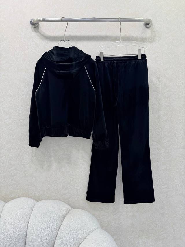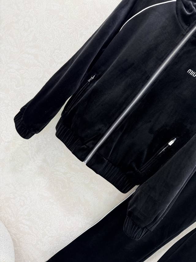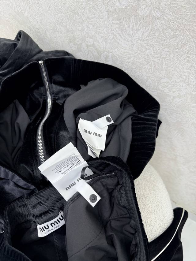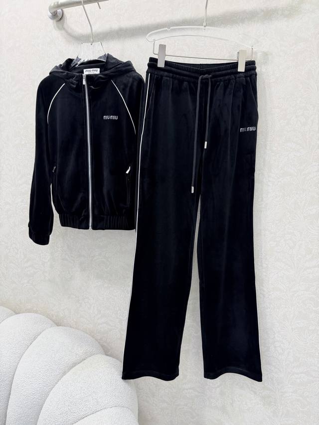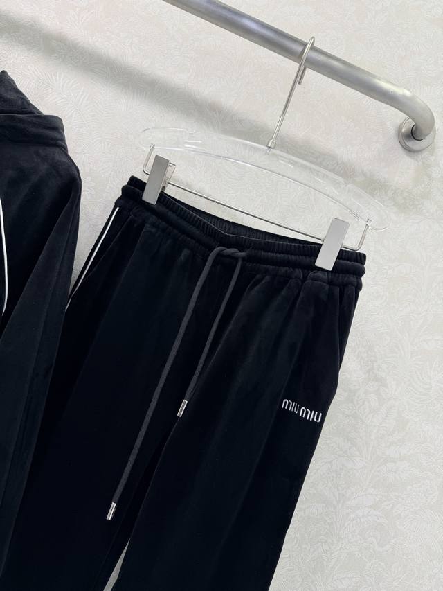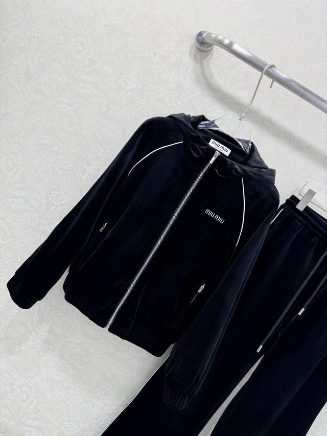 Miumi*25 New Casual Velvet Tracksuit Custom Fabric Hooded Hem Fitted Jacket Wide-Leg Pants Classic Miu Letter Decoration Sleeves Pants Label Webbing Decoration Just the Right Amount of Loose Fit Clean and Neat Cut Even without Extra Fancy Decorations, It Effortlessly Exudes an Affluent and Noble Temperament Using Simple and Exquisite Details to Highlight Unique Taste and Style Creates a Relaxed and Comfortable Everyday Wear Monochrome Size 3 Smlb DDD