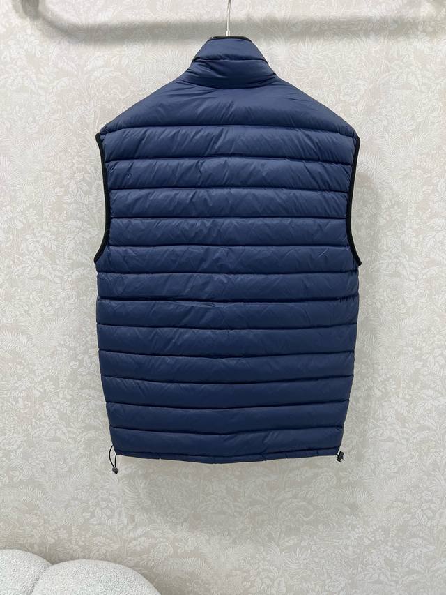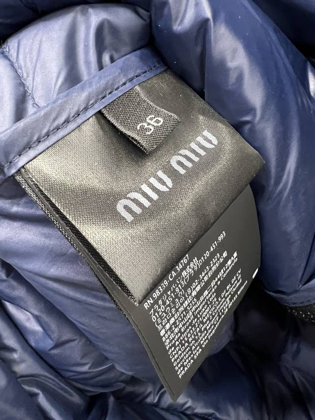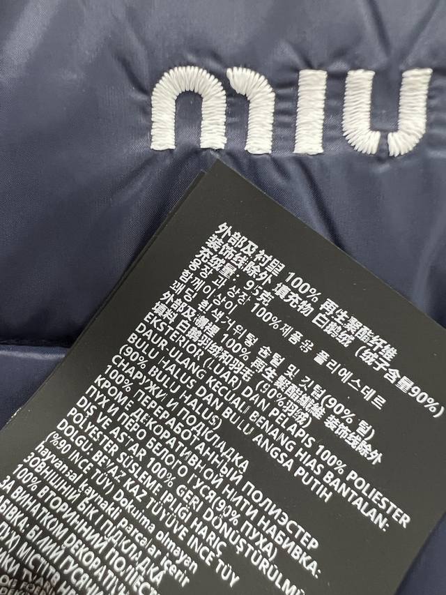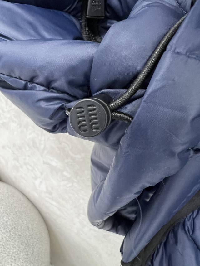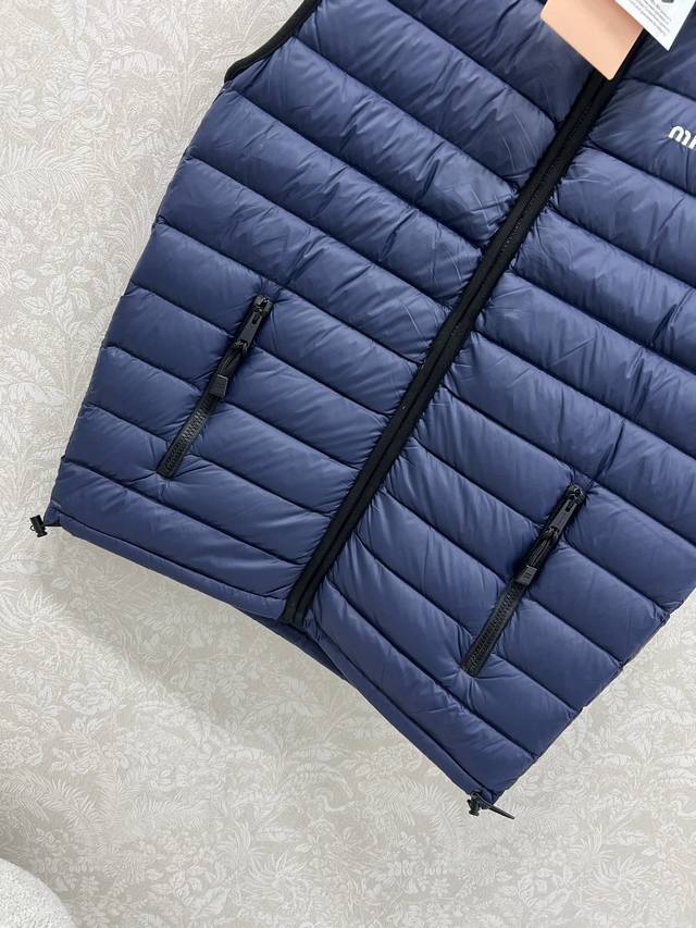 Miumi*25 New Down Vest Custom Yb Made of windproof and waterproof nylon, filled with 90% white goose down, lightweight and warm. The loose fit features a Michelin-style rectangular embossed pattern throughout, with a bold letter logo on the chest. The dark-trimmed zippered chest pocket contrasts beautifully with the overall design, exuding fashionable charm. The hem has a drawstring adjustable zippered pocket for added privacy and practicality, making it versatile and stylish for any outfit. The loose silhouette is chic and sophisticated. Available in single color, sizes S, M, L, D, D.