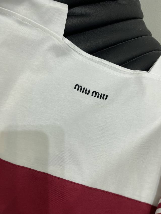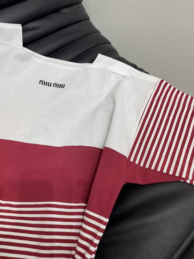 Miumi*25A new navy style embroidered patchwork striped short-sleeved T-shirt! This is a must-have for summer vacations! You can easily wear it in the style of an Instagram blogger. The exquisite version perfectly shows your beautiful curves! The