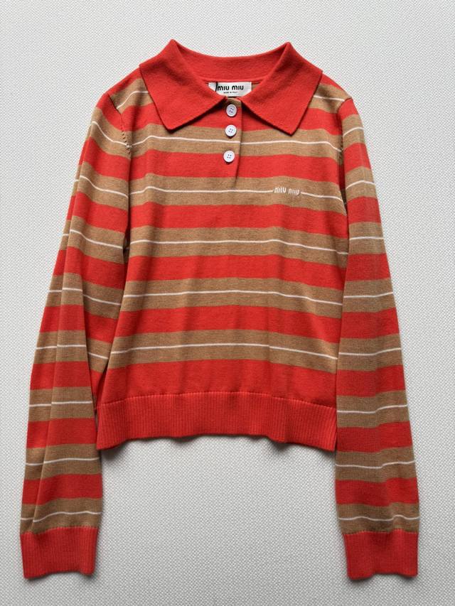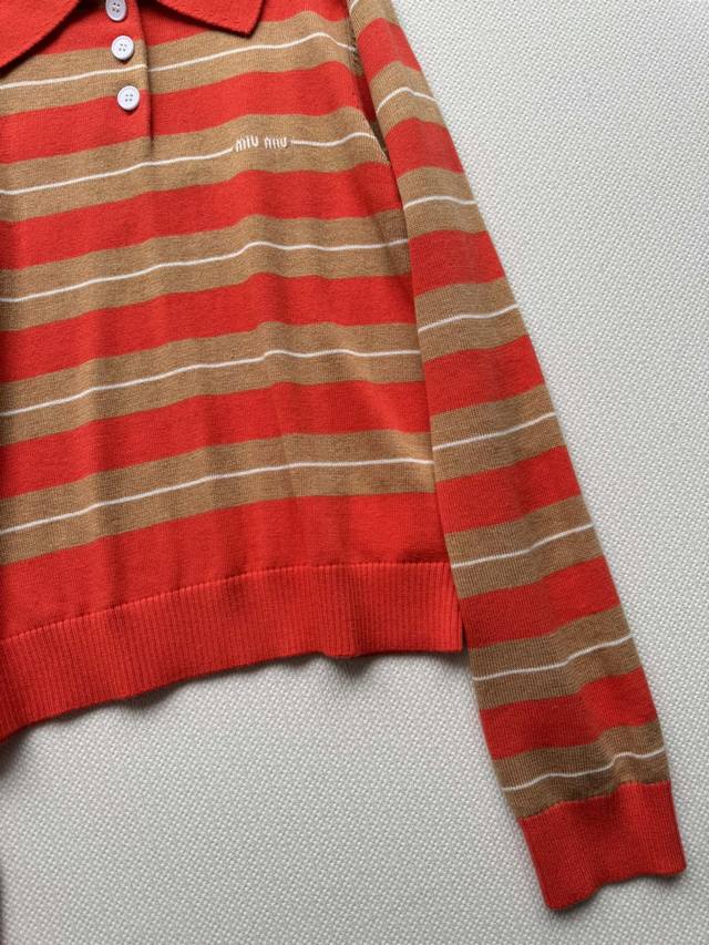 Miumi*25Fw new polo collar sweater, lapel striped design with chest logo letter embroidery, slim and versatile fabric texture is very soft Neic youthful girl style wear out the college style with a little bit of hot girl feeling, full of energy and easy to match every day Sml-