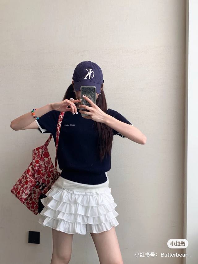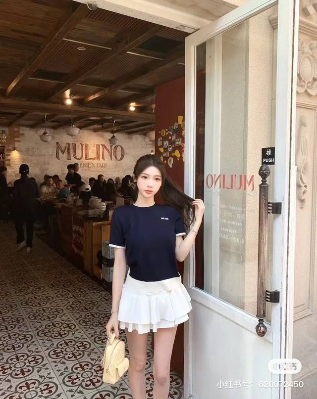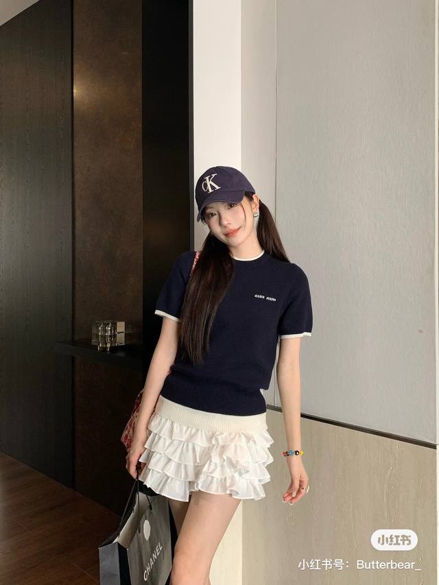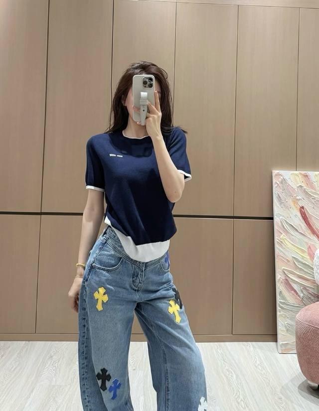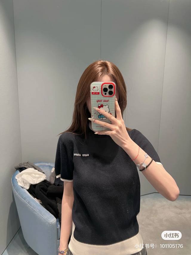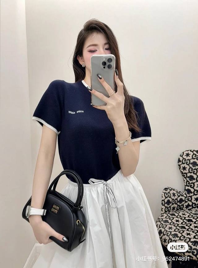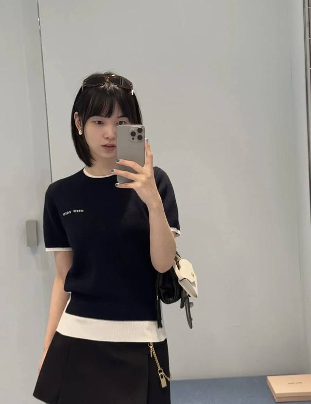 Miumi*'s new high-end custom 100% wool fabric is soft and skin-friendly! This top features a logo on the chest, jacquard pattern, contrasting trims, and a slim-fitting round neck, short-sleeved pullover sweater with elasticity! Navy blue, sizes 36, 38, and 40. Size 36: Chest 88, Sleeve 23, Length 53