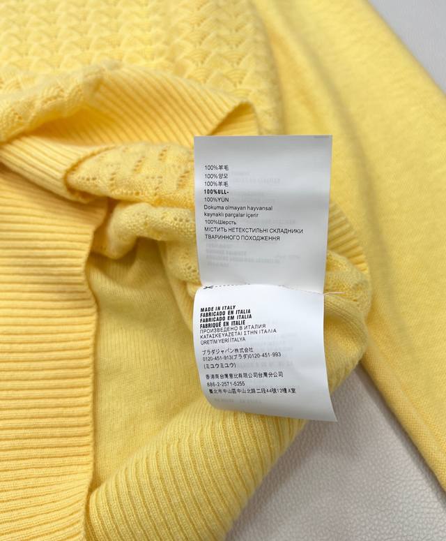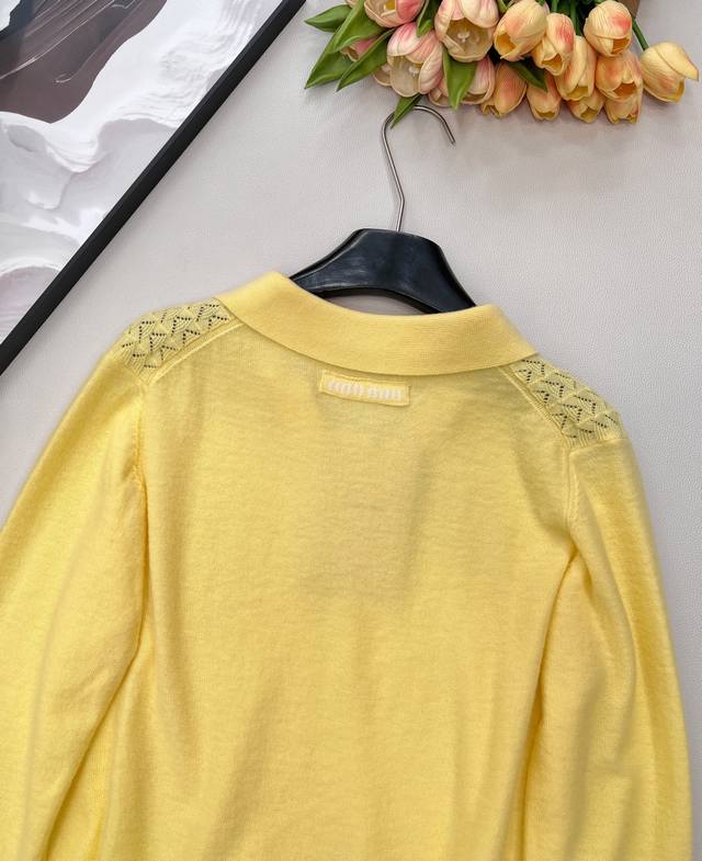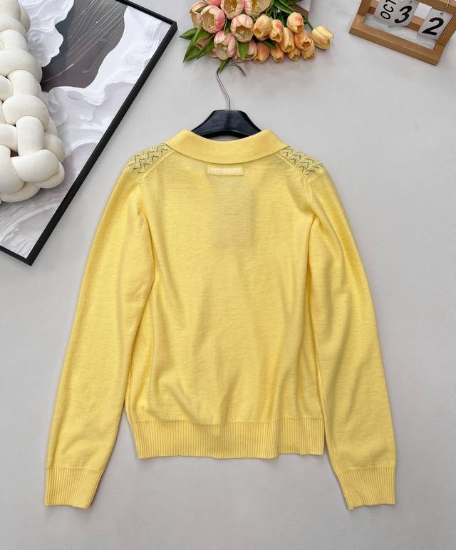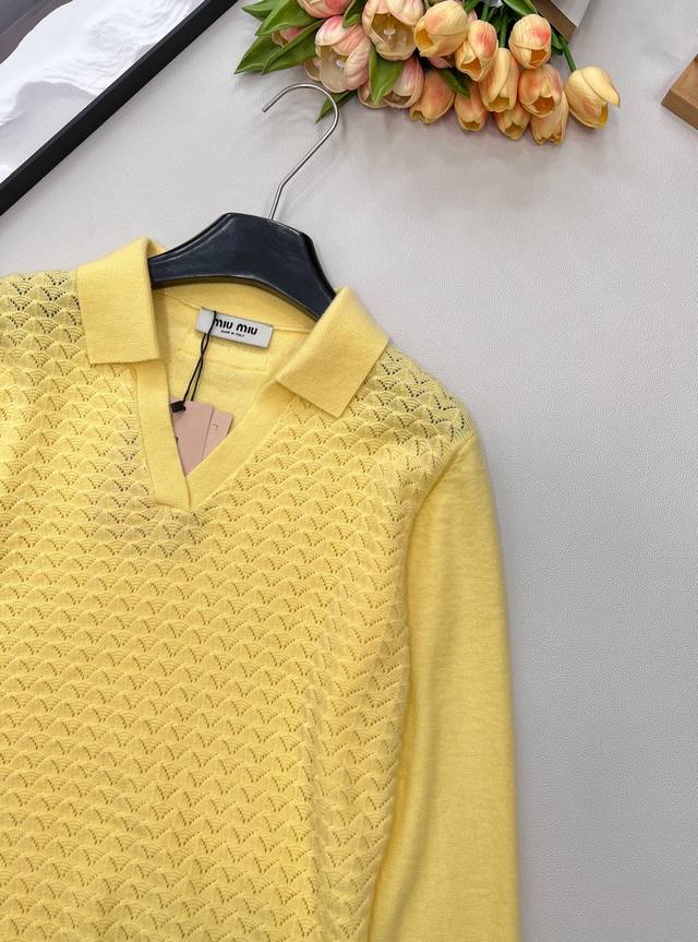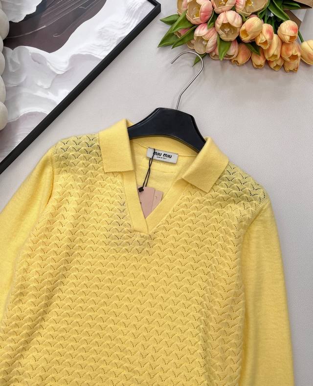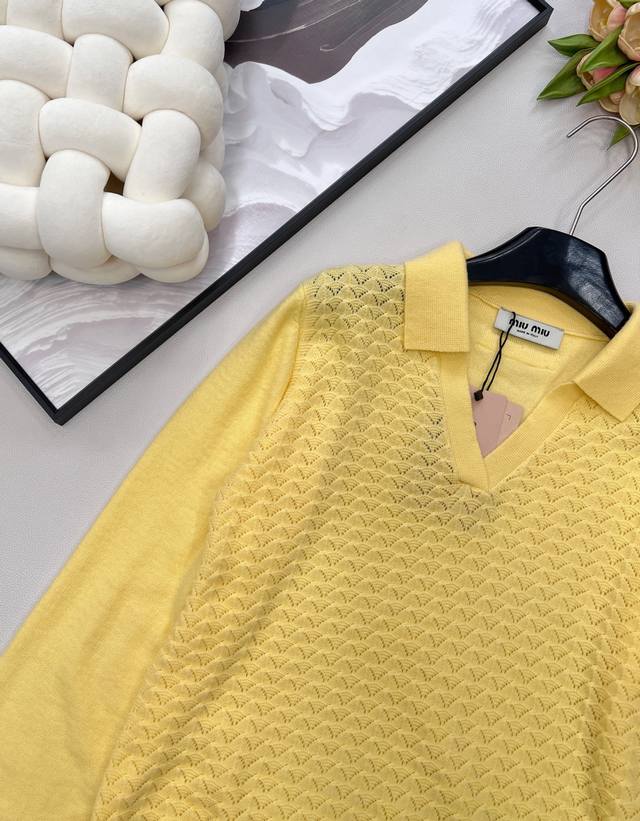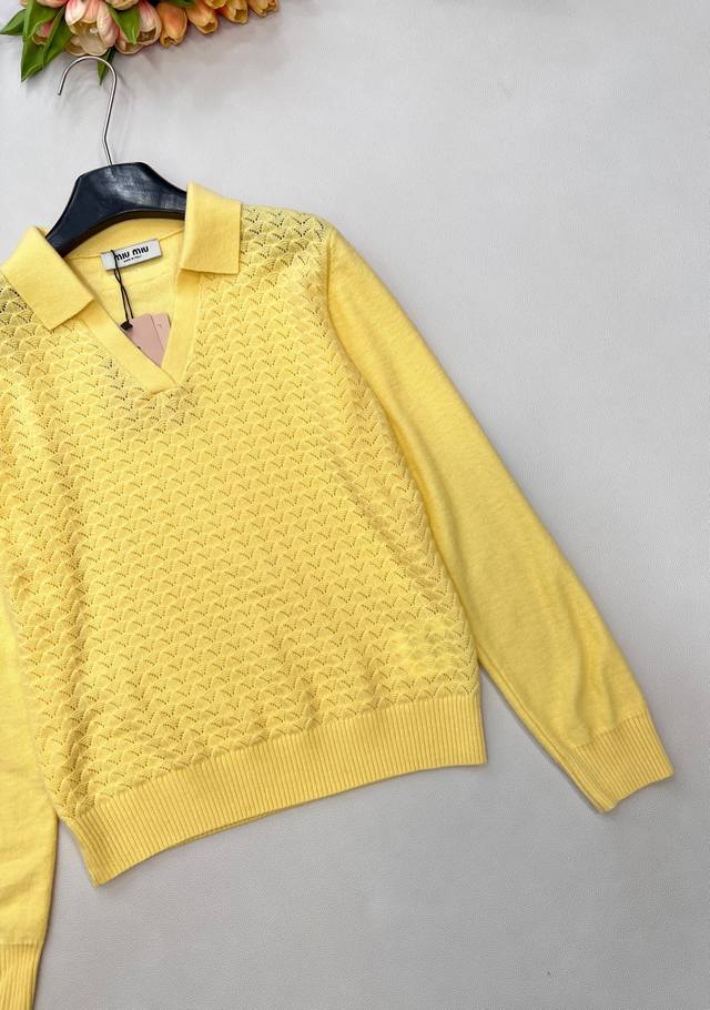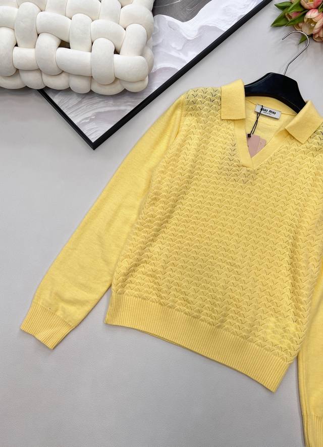 Miumiu 2025 New Collared Half-Open Sweater, made with custom Yb wool yarn, comfortable and warm, with a superior texture. The collared knit sweater features a V-neck design for a relaxed look. The hem and cuffs are finished with knitted ribbed trim, creating a sophisticated and stylish overall look. The body is covered in a fan-shaped scale pattern, contrasting with the plain knit sleeves for added depth and visual interest. This versatile style adds a touch of flair and makes it incredibly chic. All tags are included. Available in two colors . Sizes: S, M, L, Ddd. Code: M, DDD.