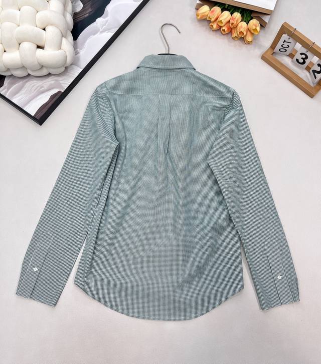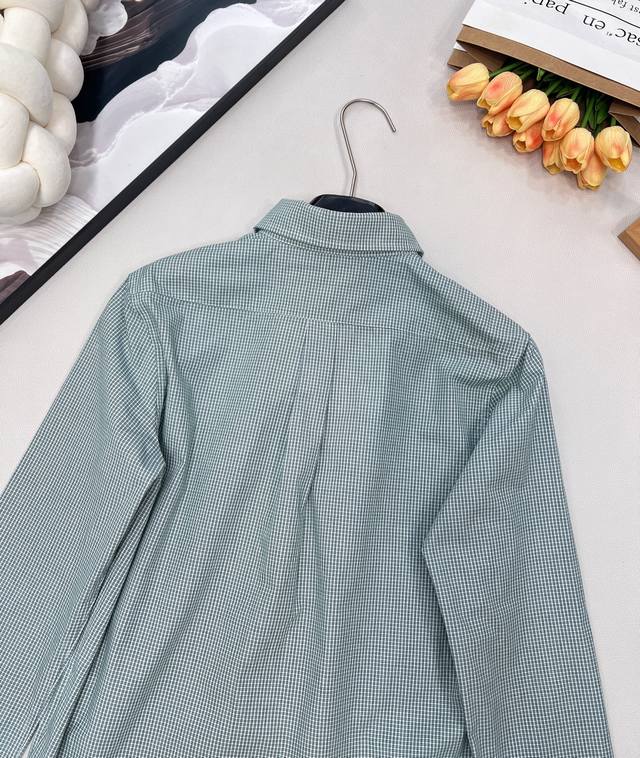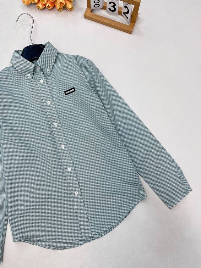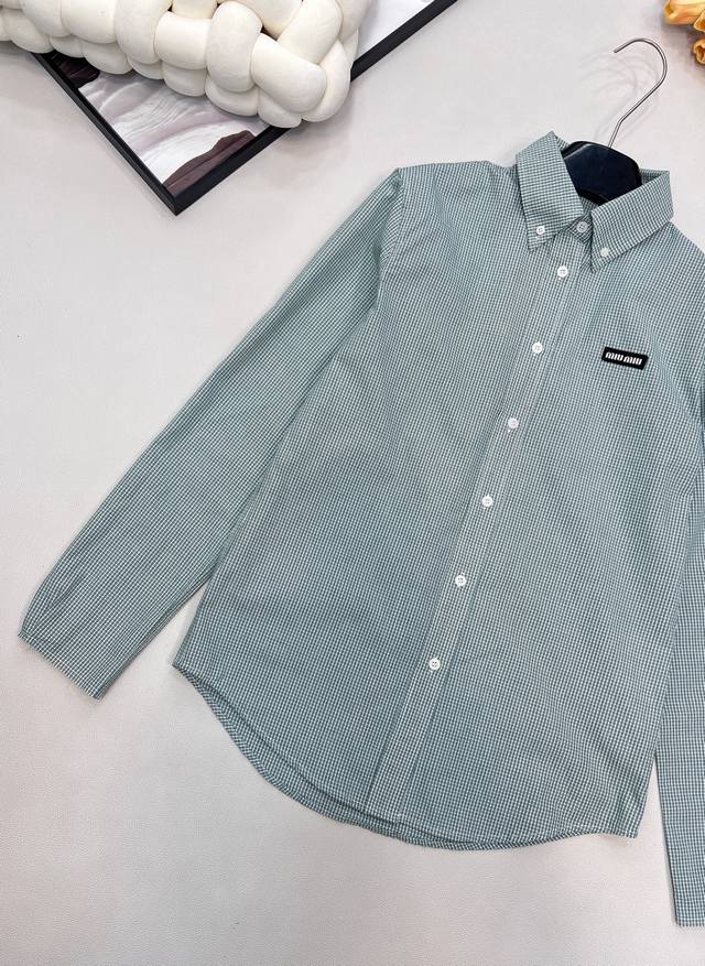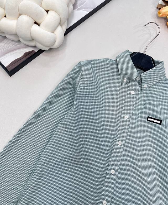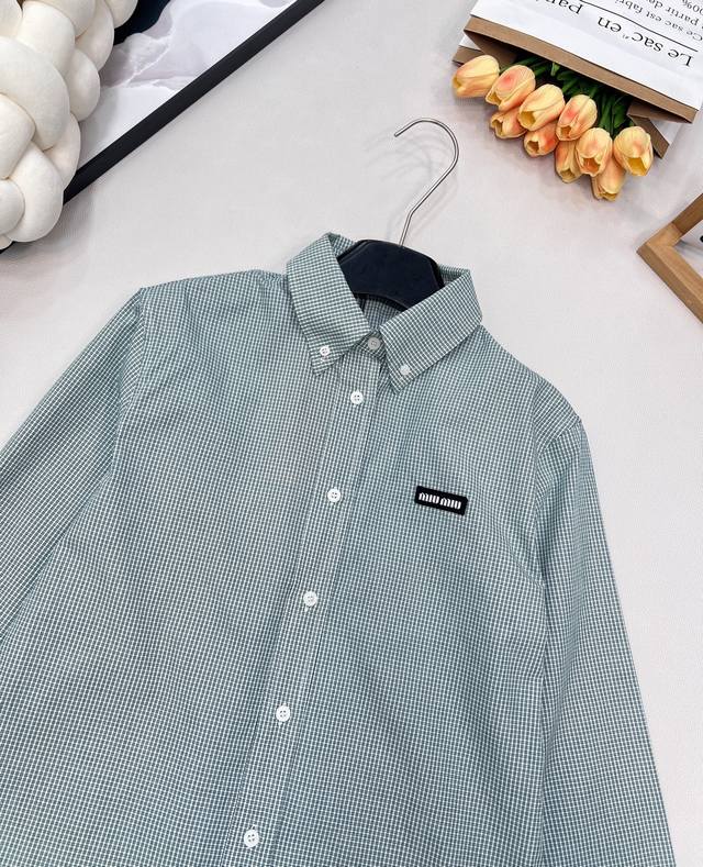 Miumiu 2025 New Letter Patchwork Regular Plaid Shirt, made of custom imported Yb cotton poplin, soft and skin-friendly, comfortable and wrinkle-resistant. Regular silhouette shirt, featuring a matching grass green plaid pattern, paired with a letter logo on the chest, presenting a unique Miu preppy style. The loose fit is adjustable for greater comfort and easily highlights a boyfriend vibe, making your outfit more fashionable. Customized fabrics and accessories, look for the complete version and labels. Bulk orders are available. Sizes S, M, L, DDD. Code M, DDD.