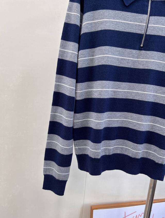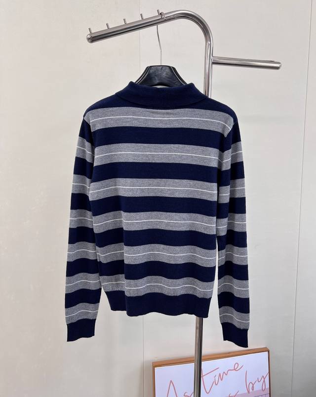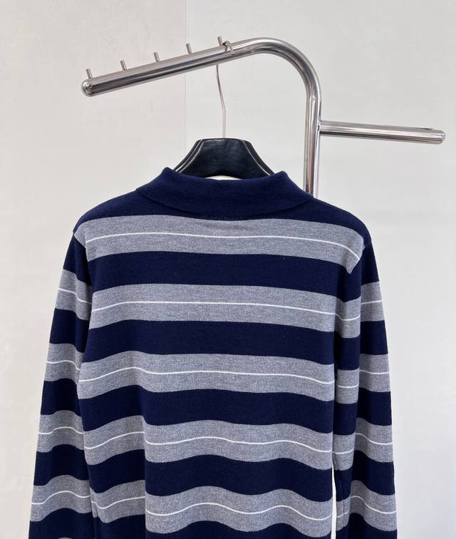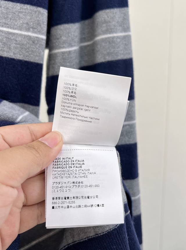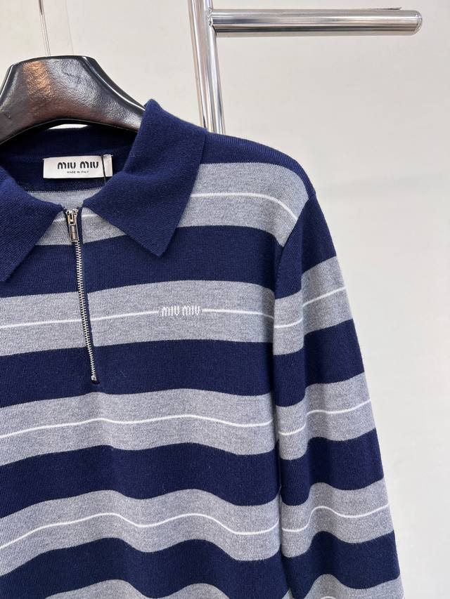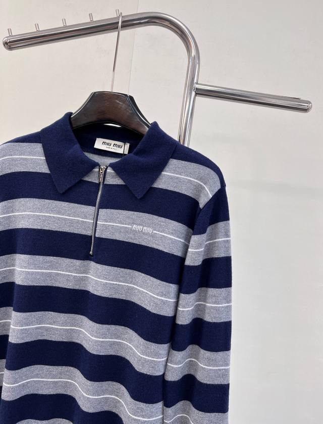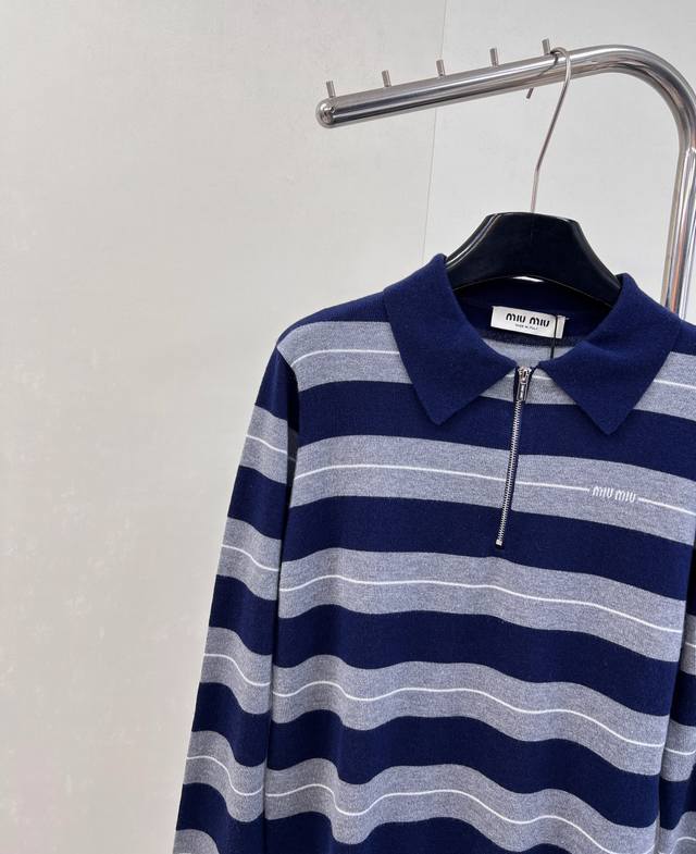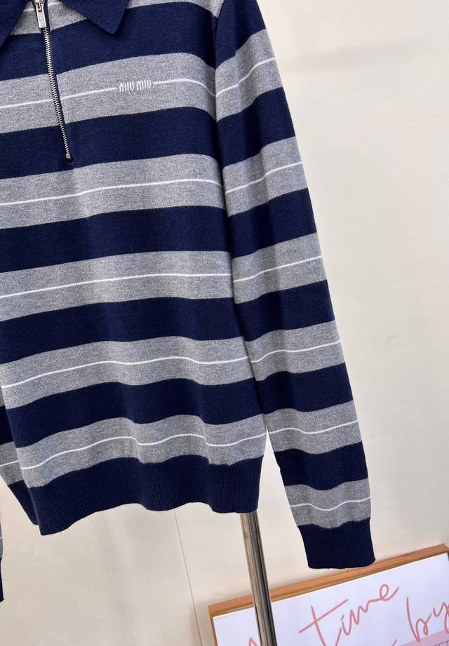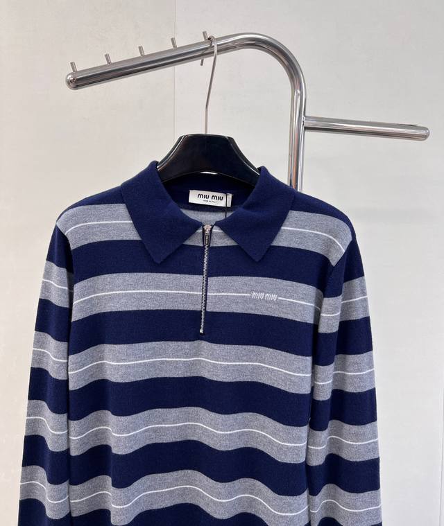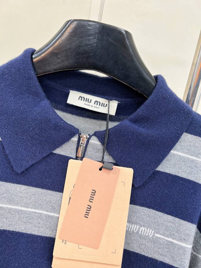 Miumiu 2025 New Style Lapel Half-Zip Knit Long-Sleeve Top. Made with custom Yb wool yarn, soft, comfortable, stylish, and slimming. The lapel long-sleeve top features a half-open button design for easy on and off. Two-tone stripes create a striking contrast, with varying thicknesses, complemented by a logo decoration on the chest. Exuding sophistication and a preppy style, it pairs well with various trousers and skirts. A must-have fashion item. Custom fabric and accessories included. All three labels are complete. Bulk orders are available. Sizes S, M, L,