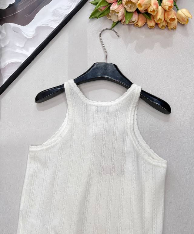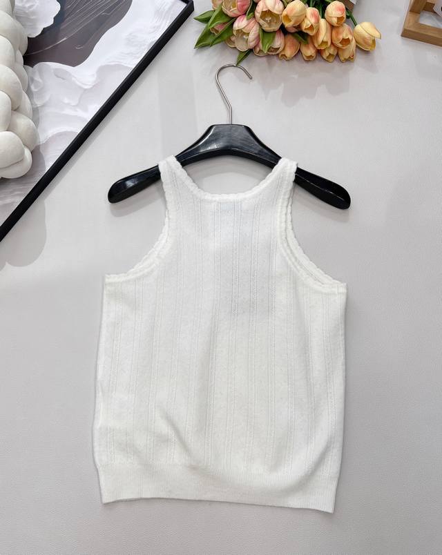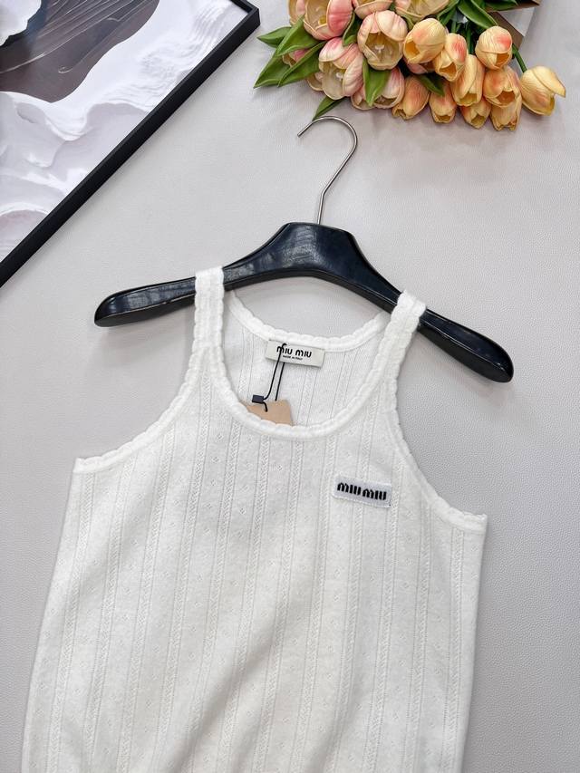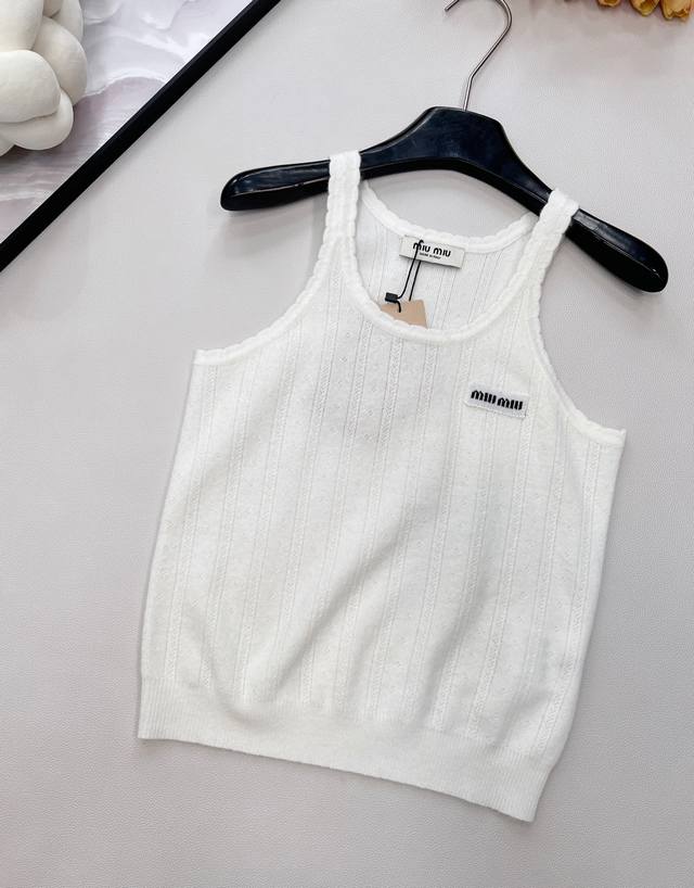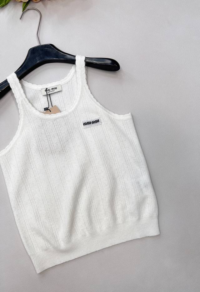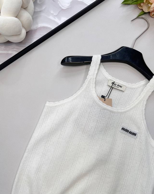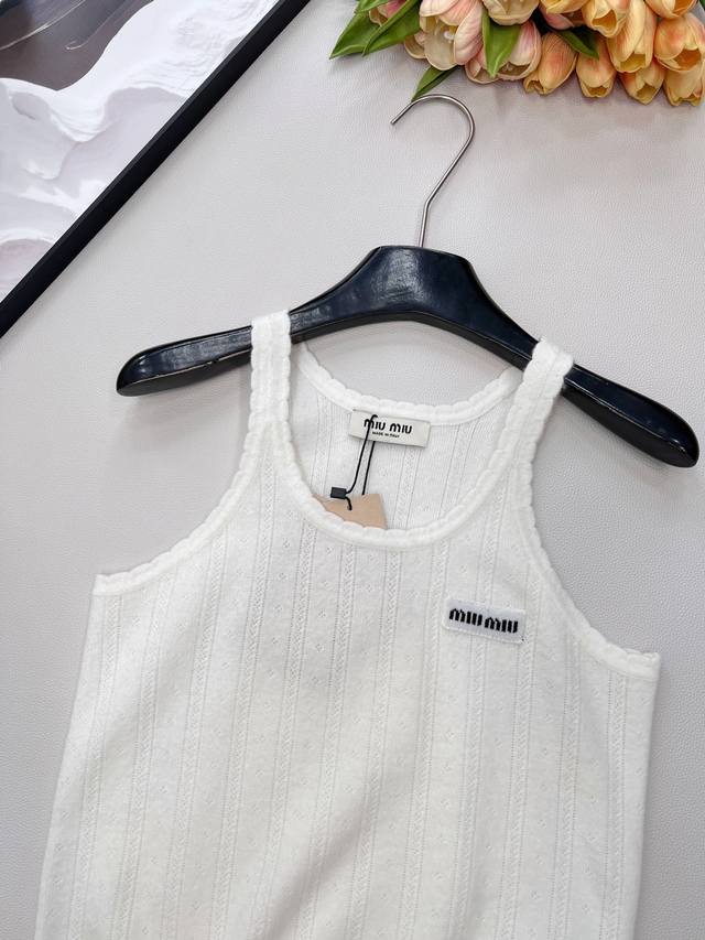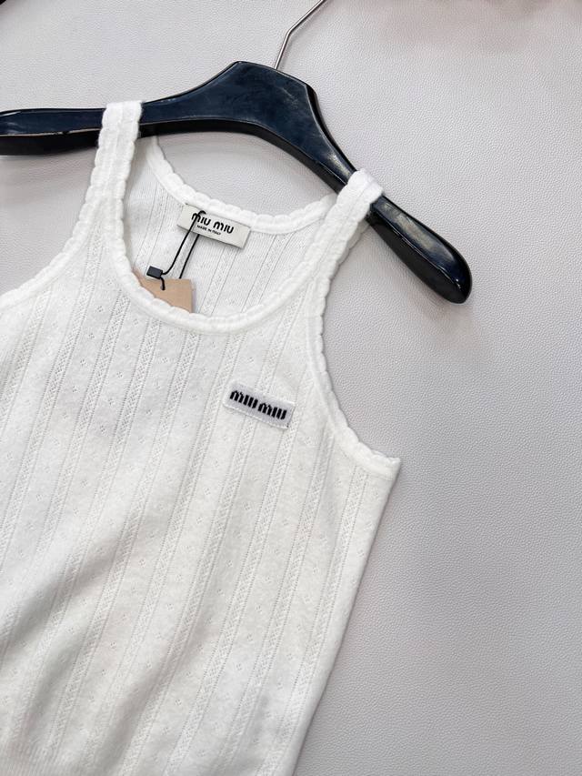 Miumiu 2025 New Wave Lace Knit Vest, made with custom Yb cashmere yarn, delicate texture, stretchy and comfortable. The vest features a finely woven crochet texture throughout, with a wave lace trim around the neckline and cuffs. The vertical ribbed cutouts on the body echo the design, highlighting a sweet and cute style. The fitted, stretchy fabric is flattering and creates a relaxed look, exuding understated luxury and fashionable style. Suitable for wearing alone or layering, all seasons. All tags are complete. Bulk order. Sizes S, M, L, Ddd. Code M, DDD.