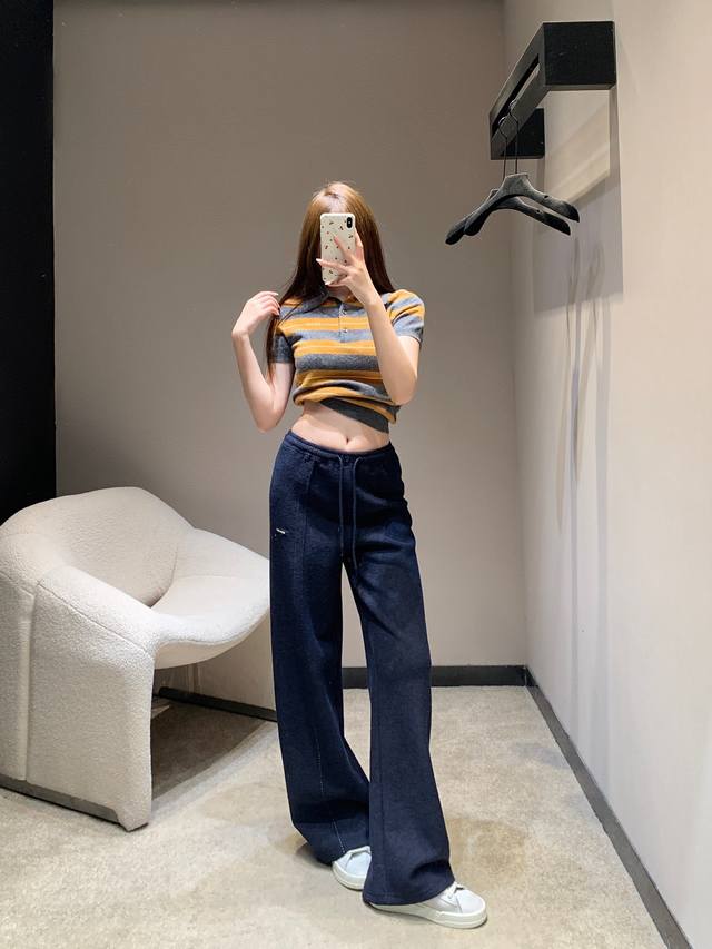 Miumiu 25Fw Autumn/Winter New Style Fleece-Lined Drawstring Casual Pants with Micro-Label | Exclusive High-Fit Production! The soft fleece-lined fabric combines warmth and comfort. The drawstring elastic waistband fits all body types, and the loose, wide-leg design is flattering and slimming. The subtle micro-label detail on the side highlights brand recognition. Available in navy blue, gray, and off-white. Effortlessly create a signature sweet and cool girl style. Perfect for autumn and winter, pairing well with crop tops and knitwear. Available in sizes S, M, L, DDD.