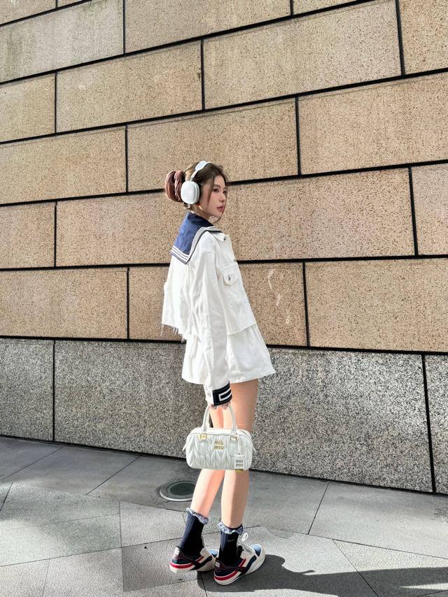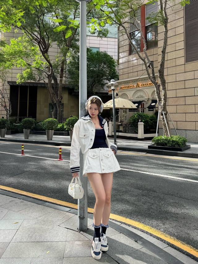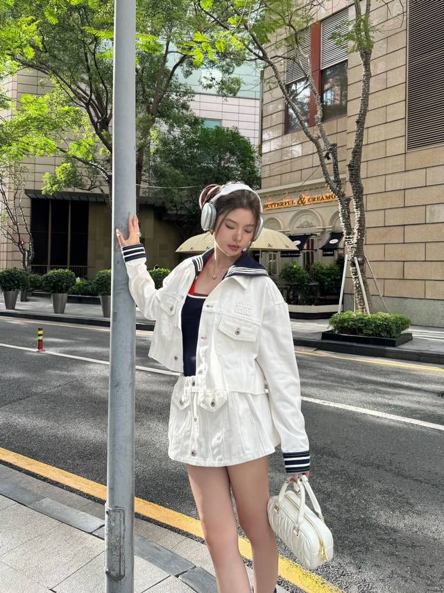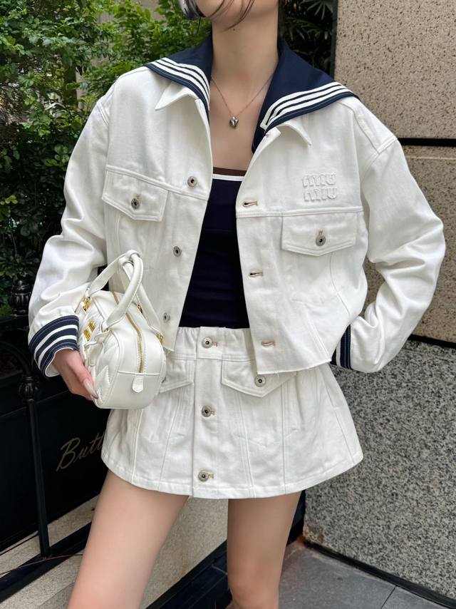 navy-collar denim jacket and skirt. Made from custom Yb twill cotton denim, this set features a premium texture and a wash process that prevents color transfer. This set features a lapel denim jacket and skirt. The cuffs and collar are embellished with navy-inspired contrasting stripes, and the design is removable. Symmetrical flap pockets on the chest feature a classic embroidered logo, adding subtle detail and highlighting the brand's refined elegance. Paired with a matching skirt, the pleated, flared hem creates a simple, eye-catching silhouette. The matching details create a relaxed and effortless look, creating a stylish and stylish outfit. The set also looks great worn separately. White!