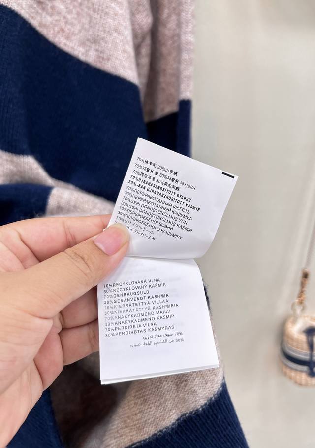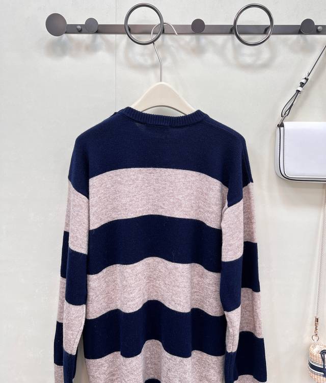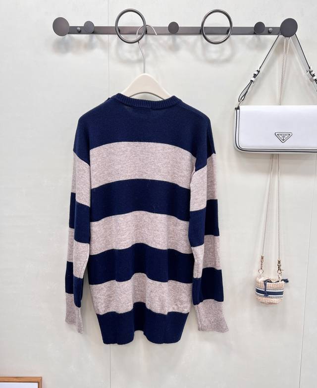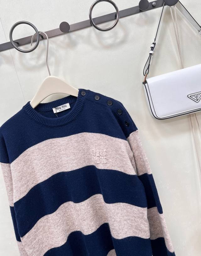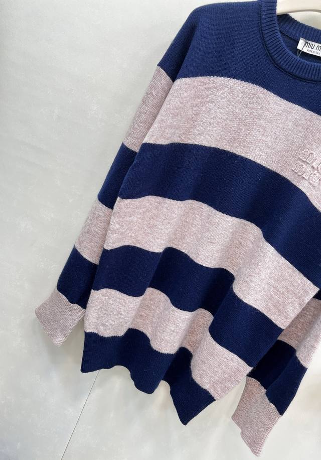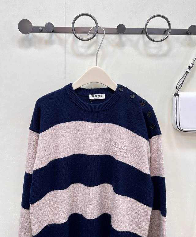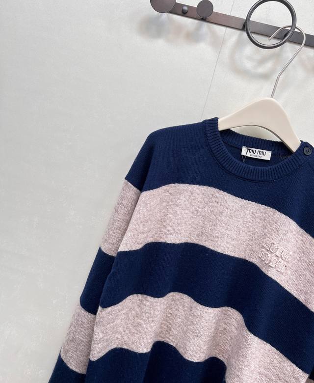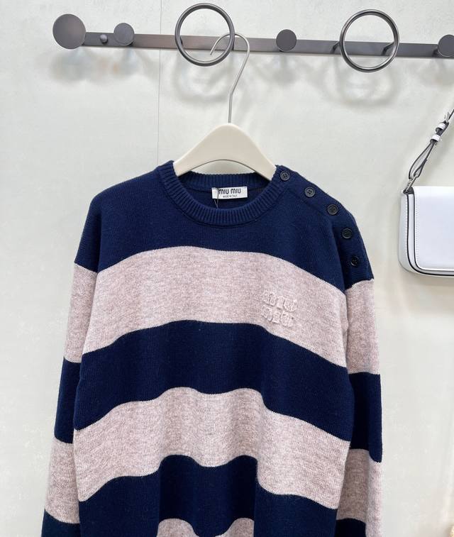 Miumiu2025 new letter striped round neck sweater, customized Yb cashmere wool yarn weaving texture, high-end wear and comfortable round neck pullover sweater tailoring, blue and gray stripes throughout the body, laying the tone of literary style, using knitted texture to complete the classic letter logo pattern on the chest, showing the brand's high-end sense, one-side shoulder embellished with round buttons, rich layers, Oversized, loose silhouette, long version, accommodating body tone, loose, high-end outer wear and inner wear are all outstanding, suitable for commuting, dating and multiple wear scenes, customized surface and accessories, three standards are complete, large goods are shipped