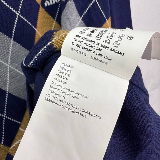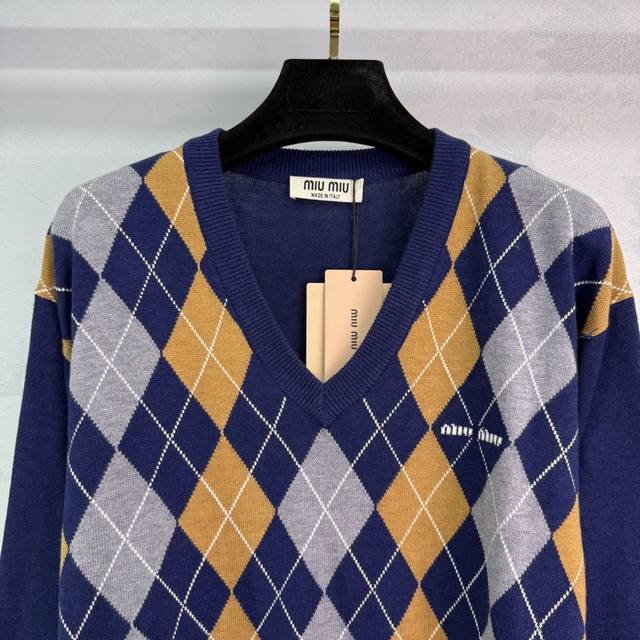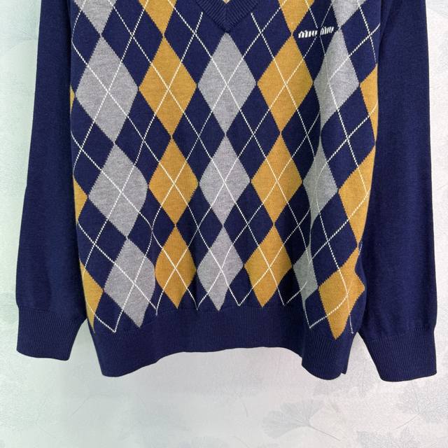 Miumiu25 This early autumn new diamond knit sweater weaves retro and exquisite into a style symbol. The classic diamond contrast is the elegant code of time precipitation. The V-neck outlines the casual outline, and the brand logo is like a secret medal. The soft and glutinous texture wraps the looseness. Wearing it is like wearing the high-end aesthetics of Fashion Week into daily life. Without deliberate effort, you can reveal the unique fashionable tone of Miu Miu in simplicity. Every stitch texture is saying: classics will never go out of style, and high-end is the relaxation engraved in the genes~Sml. T226B