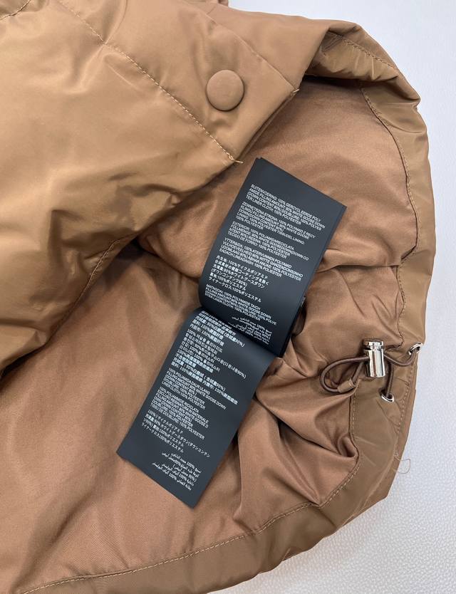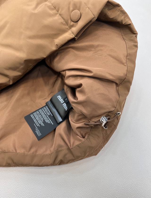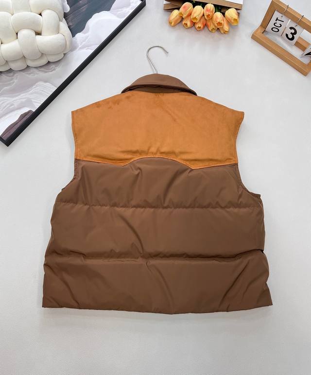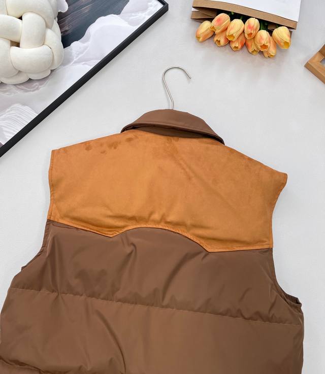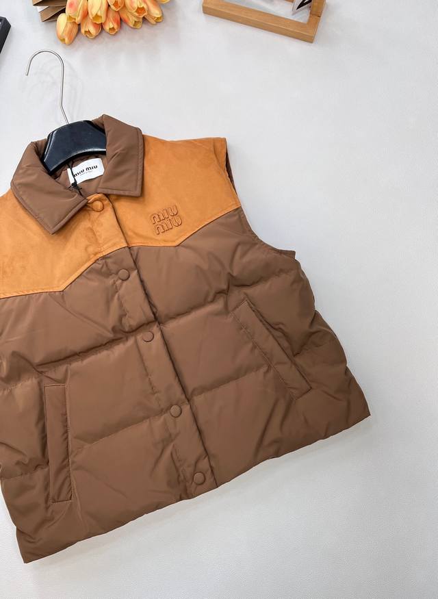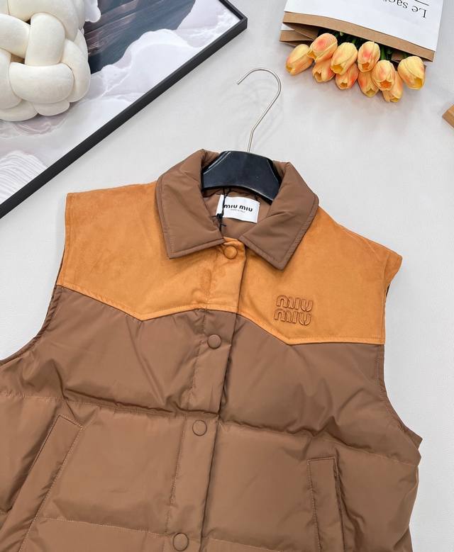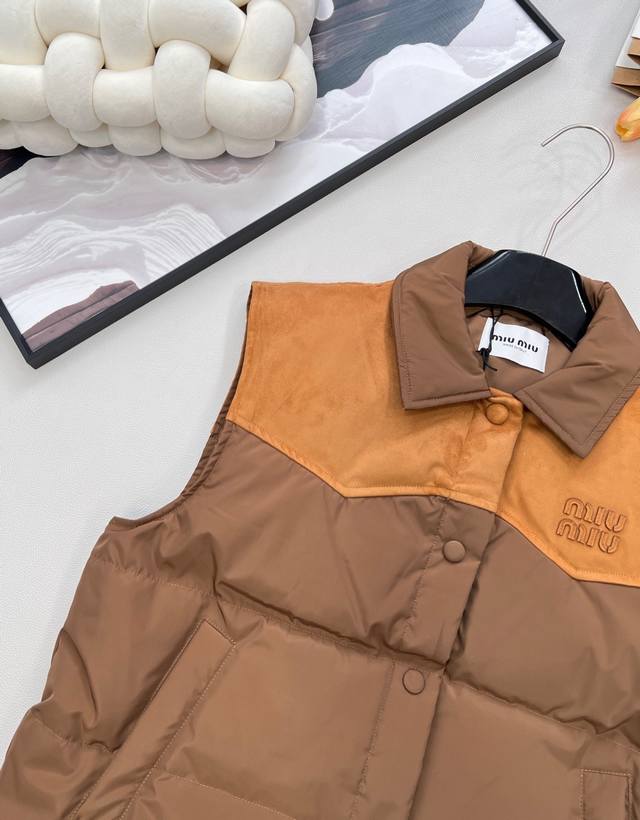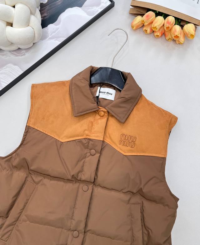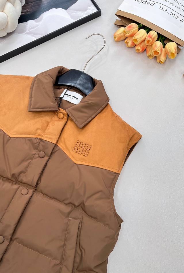 Miumiu25Fw Autumn/Winter New Leather Logo Lapel Patchwork Color-Blocked Down Vest | Exclusive High-Quality Production! Featuring leather patchwork and a letter logo as its core design, the collar and shoulder areas are crafted from caramel brown suede-like leather, contrasting beautifully with the main body's milk tea apricot nylon fabric, creating a retro and relaxed look. Filled with 90% white goose down, it offers high loft without feeling heavy, balancing autumn/winter warmth with the versatility of everyday wear. The lapel design is perfect for layering, and the single-breasted button closure makes it easy to put on and take off. The quilted down filling provides warmth without being bulky. Available in two colors. Sizes: Sml Ddd Code: M DDD Ddd