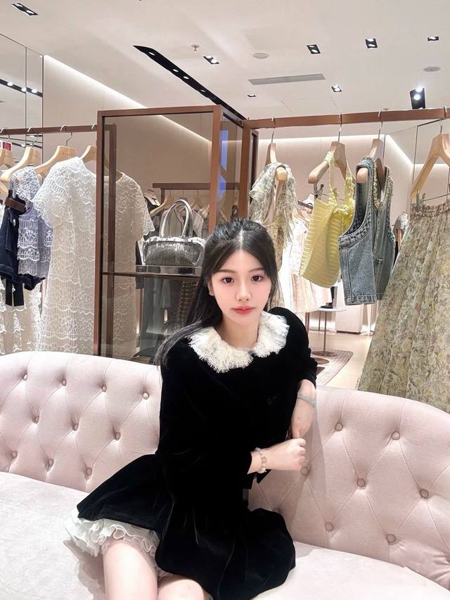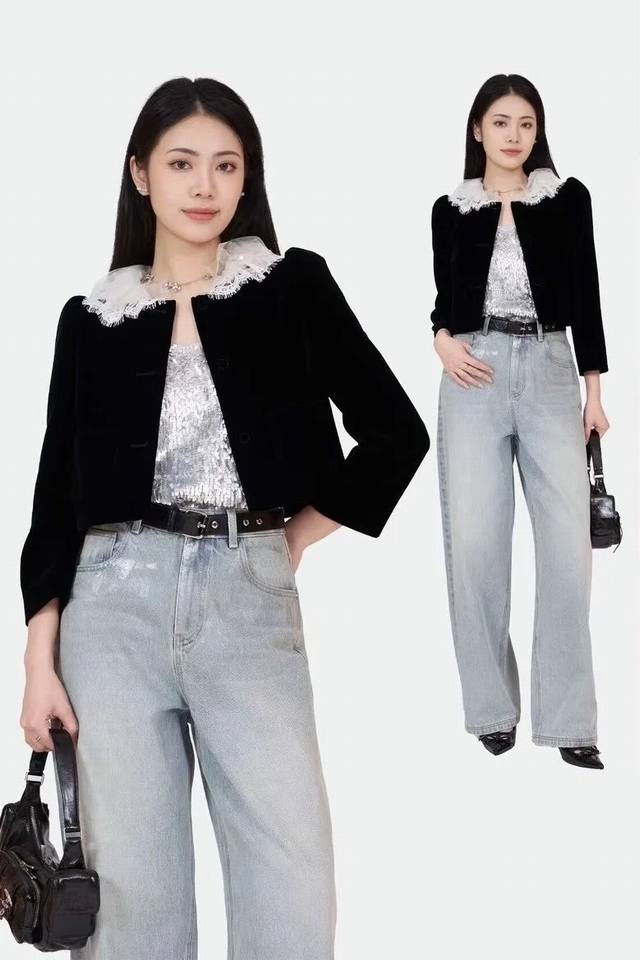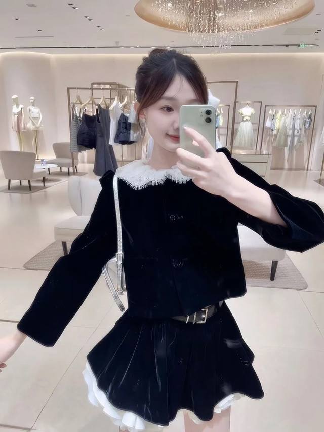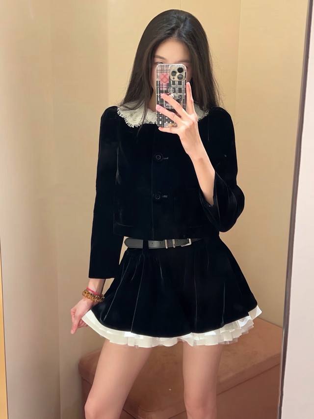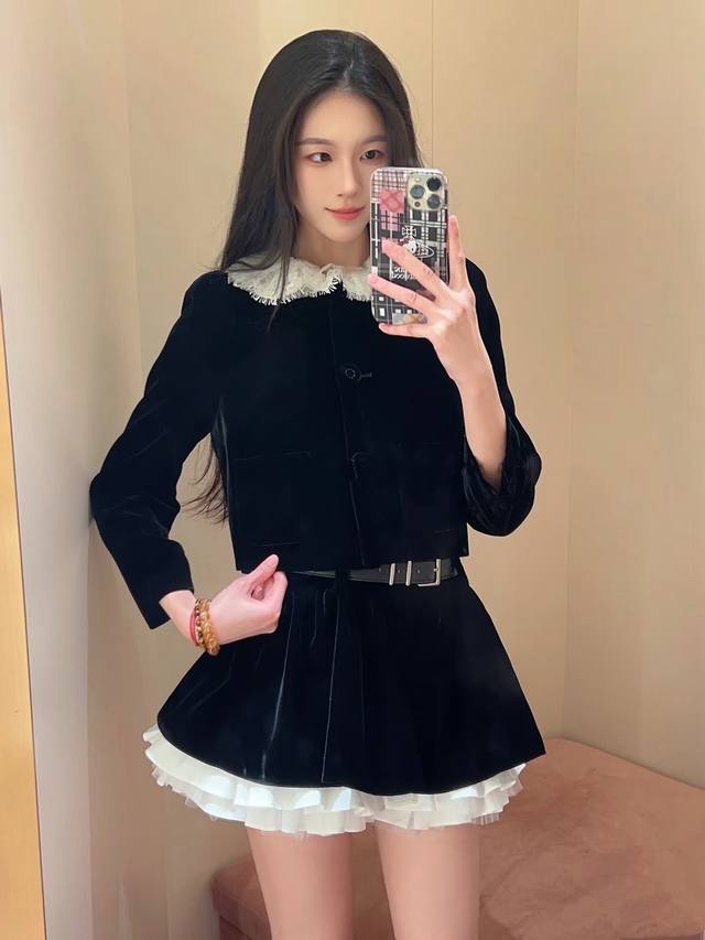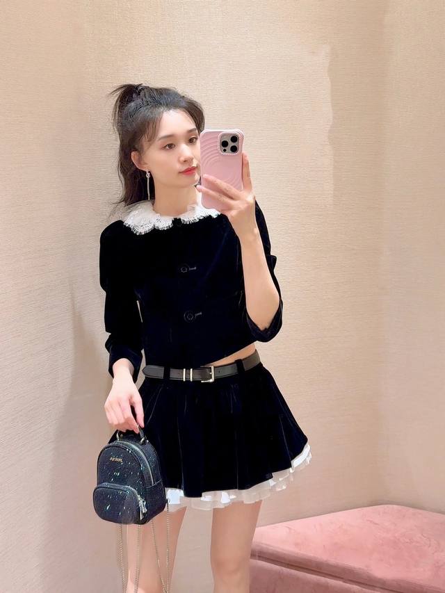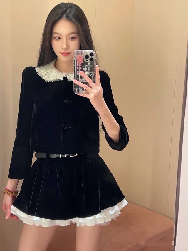 Miumu 2025 early autumn new style this season's Juejuezi velvet jacket. Her brand really understands girls' minds. Sweet lace lace versatile jacket embroidered sequins detachable collar princess playful feeling full short jacket very slender figure can be matched with high-waisted jeans, wide-leg pants, shorts, skirts