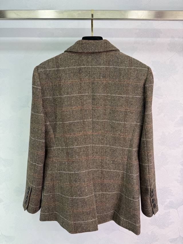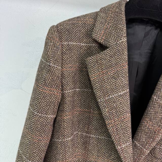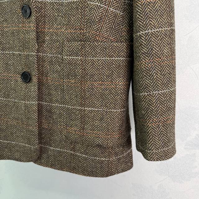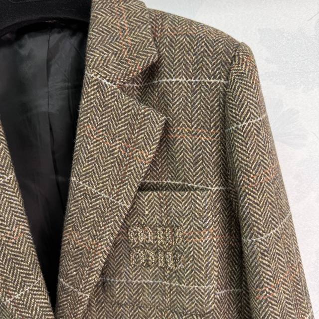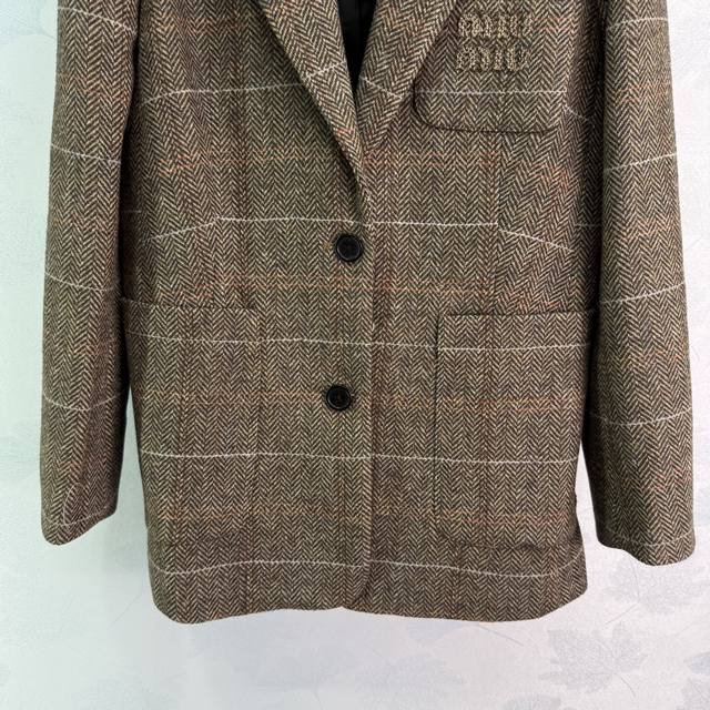 Miu's new wool blazer from 2015 features the incredibly popular Maillard colorway, a vintage-inspired look. Customized hardware features a Miu label on the chest, creating a casual and stylish look. The herringbone check wool material is rich and substantial, exuding a classic, sophisticated aura. A favorite among countless bloggers, this fitted jacket boasts a flattering, relaxed, and relaxed silhouette, offering excellent warmth and practicality. Available in a solid color, size 3 (Sml T226B).