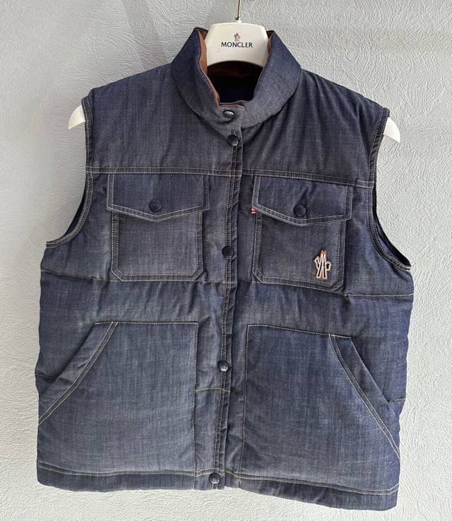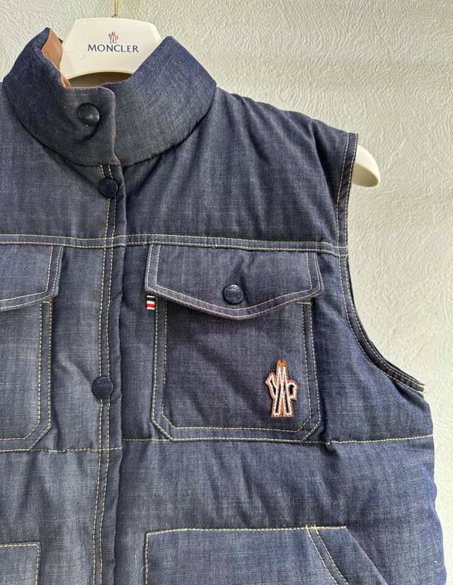 Mon* 2025 Autumn/Winter New Arrival. Stand-up collar denim down vest. A youthful and stylish puffer jacket with a chic, age-defying look. The H-line silhouette is incredibly versatile and easy to style! Made with standard 90% white goose down filling. Sizes: 1, 2, 3. Size 1: Chest 106cm, Length 57cm.