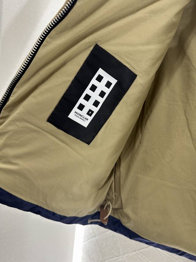 Moncle* 2025 New Arrivals: Stand-up Collar Contrast Color Down Vest. Made from custom Yb windproof and waterproof nylon with a white goose down lining, this loose-fitting vest is stylish and effortless. The stand-up collar offers warmth and protection from the elements, while the classic checkered pattern features the iconic brand emblem on the chest. Zippers on the shoulders and front pockets create a rich, layered look. Zippered pockets and labeling highlight the brand's lining, making it a perfect layering piece for fall and winter. Filling Standard: National Standard 90% down. Filling Material: White goose down. Customized fabric and accessories: High-quality, two-color 48-56.
