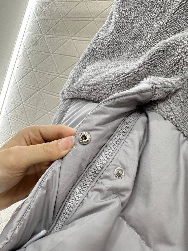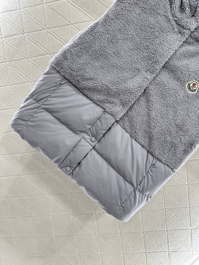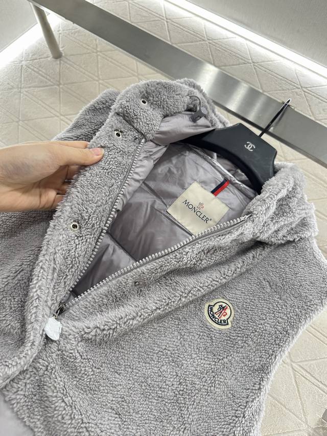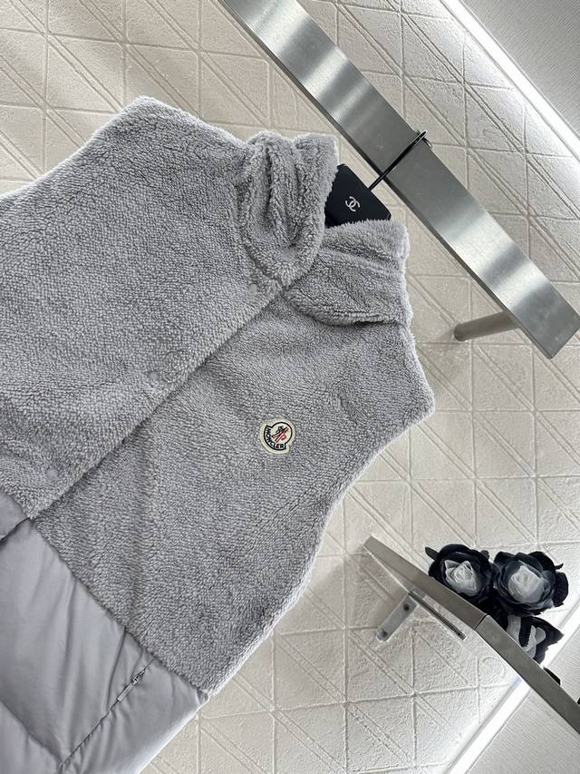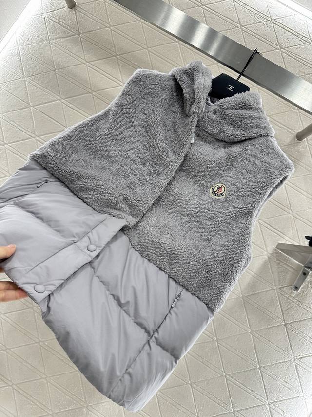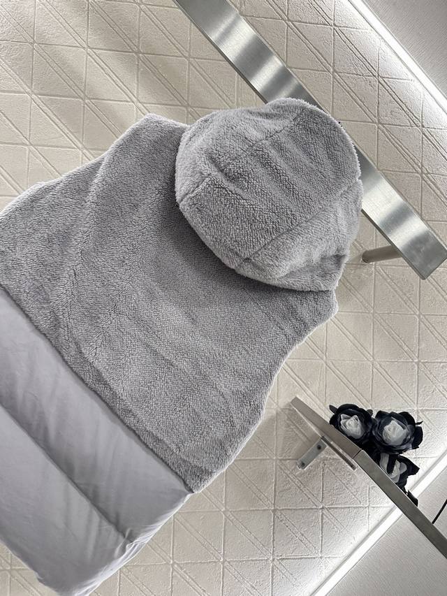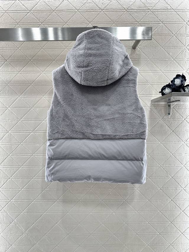 Teddy Plush Zippered Down Vest. The upper portion is adorned with three-dimensional, fluffy Teddy plush for a soft and comfortable texture. The hooded, drawstring, zippered vest features a stylish, fashionable cut. The lower half of the nylon is exposed, while the upper half has a furry feel. The chest badge highlights the brand's style. The silhouette adjusts to the body, creating a straight, straight-cut silhouette. The inner elastic band enhances ease of entry and d